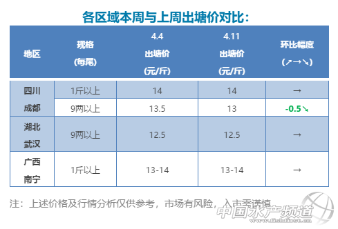 中國水產頻道獨家報道, 華南養戶待價惜售,華東卻趕著清塘放苗! 文/圖杰大飼料 水產前沿實習編輯李曉欣聯合發布 本周各產區加州鱸行情 廣東順德:今天報價6兩上10.4元/斤左右,7兩上11-11.1元/斤,8兩上12元/斤。8兩上加州鱸塘頭價從7號開始回升至12元/斤,由于存塘的商品魚養殖成本增大,養殖戶出魚積極性仍舊不高。6兩上規格報價較為混亂,主要看魚塘大規格魚所占比例。目前魚車抓魚較為嚴格,特別是7兩上、8兩上規格相差1兩,價格卻相差1元/斤,很多養戶不愿出7兩上規格,觀望心理增強。 廣東南海:今天報價6兩上10.4元/斤左右,7兩上11元/斤左右,8兩上12元/斤,實際成交價與報價有0.2元左右出入。近來南海出魚的養殖戶不多,特別是沙頭九江地區,出魚的養殖戶很少,加上沙頭傳統養舊魚模式,目前的價格還未達到養戶心理預期,惜售心理較強。 浙江湖州:今天報價8兩上11.5元/斤,統貨報價9.5-10元/斤,本周價格變動不大。從浙江湖州整體來看,近期魚價或有下滑趨勢:一方面,清明節后當地養殖戶趕著放鱸魚苗,出魚養殖戶較多;另一方面,湖州地區鱸魚的整體條形相比江蘇吳江較差,流通商更青睞到吳江收魚,預計近期價格上漲機會不大。 江蘇吳江:今天報價8兩上12元/斤,統貨報價10-10.5元/斤,8兩上價格相比上周跌了0.5元/斤。目前吳江地區許多養殖戶趕著清塘放苗,出魚量較大,加上清明節前后外地水車到本地裝魚較少,價格略有下降。 四川成都:今天報價9兩上13元/斤,1斤以上14元/斤,9兩上價格相比上周跌了0.5元/斤。當地部分養殖戶為避免加州鱸排卵后變瘦以及產后病,趕在產卵前出魚,出魚量有所增多。 湖北武漢:今天報價9兩上12.5元/斤,價格相比上周持平。目前湖北地區放苗養殖戶有所增多,據當地一養殖戶反映,其本來預計10號放苗,但因最近苗少,放苗時間推延到20號左右。 廣西南寧:今天報價1斤上價格13-14元/斤,價格相比上周持平。目前養殖戶普遍待價惜售,下周將迎來農歷三月三傳統節日,預計后市或會有所上升。 【關鍵字】:加州鱸 價格行情 水產養殖 |