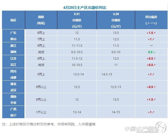文/圖 水產前沿 實習編輯李曉欣 中國水產頻道獨家報道, 行情大好,4月份各產區漲勢喜人! 廣東佛山 下旬“三連漲”,漲幅高達1.5元 今天報價7兩上12.5元/斤,8兩上13.5元/斤,這是本月以來的第3次漲價,漲幅0.5元/斤。21日,廣東8兩上鱸魚12元/斤的價格維持了13天后開始上漲0.5元/斤,漲至12.5元/斤;23日,12.5元/斤的價格僅維持1天,再度上漲0.5元/斤,漲至13元/斤;據廣東何氏水產采購部經理吳義透露,今天8兩上加州鱸價格再次飆升0.5元/斤,漲至13.5元/斤! 本月價格上漲原因,一方面是近期鱸魚產卵后體重下降,無形中增加了養殖成本,養戶對出魚價格的期望值有所提高而待價惜售;另一方面是流通商收購量不足,為提高養戶出魚的積極性、保證有足夠的收購量而提高了收魚價格。臨近五一節日,預計魚價還有上漲空間。 浙江湖州 出魚量大,價格持穩 今天報價8兩上11.5元/斤,統貨報價9.5-10元/斤,價格持平。4月以來湖州地區魚價較為平穩,一方面,清明節后當地養殖戶趕著放鱸魚苗,大多以統貨規格積極出魚;另一方面,湖州地區鱸魚的整體條形相比江蘇吳江較差,流通商更青睞到吳江收魚,故魚價基本上無較大浮動。 目前湖州地區魚苗投放已接近尾聲,據了解,目前當地魚苗成活率較好,患病情況較少。接下來即將進入馴化期,這個時期易發寄生蟲、腸炎、熟身等病害,建議養殖戶要提前預防。 江蘇蘇州 小幅上漲0.5元/斤 今天報價8兩上12.5元/斤,9兩上13元/斤,統貨報價10-10.5元/斤。4月以來吳江地區價格從12元/斤漲至12.5元/斤,漲幅0.5元/斤。吳江地區基本都已放苗,目前苗較健康,沒有出現太多的病害和損耗。由于老口鱸魚處于產卵階段,大多養殖戶不考慮出魚,故最近水車多收不夠魚,致使魚價有所上漲。 四川成都 波動較大,漲幅1元/斤 今天報價9兩上14.5-15元/斤,本月以來四川地區價格波動較大。11日,價格從13.5-14元/斤下跌到13元/斤,因當地部分養殖戶為避免加州鱸排卵后變瘦以及產后病,趕在產卵前出魚,出魚量有所增多。18日,價格從13元/斤飆升到14-14.5元/斤,漲幅達1-1.5元/斤。23日,由于四川地區存塘量逐漸減少,價格上漲至14.5-15元/斤。據悉,四川地區目前只有少量存塘魚夠規格上市,預計后市價格或再上漲。 湖北武漢 波動不大,小漲0.5元/斤 今天報價9兩上12.5-13元/斤,個別條形較好的報價13元/斤。本月以來湖北地區加州鱸價格穩中有升,從12.5元/斤漲至13元/斤,漲幅0.5元/斤。目前湖北地區放苗養殖戶有所增多,部分養殖戶在觀望價格出魚。 湖南華容 存塘量減少,大漲1.5元/斤 今天報價9兩上13.5元/斤,上漲了0.5元/斤。本月以來湖南地區鱸魚價格從12元/斤上漲至13.5元/斤,漲幅高達1.5元/斤!據悉,目前湖南地區存塘量較少,水車多收不夠魚,故價格有所上漲。 廣西南寧 穩中有升,漲幅1元/斤 今天報價1斤以上14-15元/斤,本月以來廣西地區加州鱸價格從13-14元/斤上漲至14-15元/斤,漲幅1元/斤。受廣東魚價上漲影響,目前廣西當地養殖戶出魚意愿一般。 【關鍵字】: 廣東 加州鱸 漲 水產養殖網 |