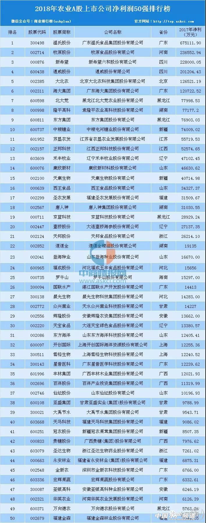 中國水產頻道報道,日前,農業行業有84家上市公司披露了2017年報。在2018年農業A股上市企業凈利潤50強排行榜中,50強農業上市企業凈利潤總額為263.13億元。 具體來看,2018年農業行業凈利潤排名前十企業依次為溫氏股份、牧原股份、新希望、通威股份、大北農、海大集團、北大荒、隆平高科、東方集團、中糧糖業。 其中,溫氏股份最賺錢,以67.5億凈利潤位列榜首;牧原股份則以23.67億元排名第二;新希望位列第三,2017年新希望凈利為22.8億元。值得提出的是,2018年農業A股上市企業中,排名前四企業凈利均超20億,其凈利總額為134.09億元。以下為2018年農業行業上市公司凈利潤排名情況: 2018年農業A股上市公司 凈利潤50強排行榜 溫氏股份 4月9日晚,廣東溫氏食品集團股份有限公司(簡稱“溫氏股份”)發布2017年年度報告,稱報告期內公司實現銷售收入556.57億元,同比下降6.23%;實現歸屬于上市公司股東的凈利潤67.51億元,同比下降42.74%。業績同比下降的主要原因是受養豬、養雞業務市場行情波動影響。值得一說的是,構建產業鏈閉環模式的溫氏股份,2017年末的應收賬款僅1.73億元,占總資產的0.35%。 通威股份 3月30日,通威股份發布2017年年度報告。報告期內,通威股份實現營業收入260.89億元,同比增長24.92%;實現歸屬于上市公司股東的凈利潤20.12億元,同比增長96.35%,其中扣除非經常性損益后歸屬于上市公司股東的凈利潤19.62億元,同比增長219.96%。公司各業務板塊均呈現較快速度增長。 大北農 3月30日晚,北京大北農科技集團股份有限公司(簡稱“大北農”)發布2017年年度報告,報告期內,公司實現營業總收入187.42億元,比上年同期增長11.29%,營業利潤15.77億元,比上年同期增長55.47%,利潤總額15.67億元,比上年同期增長40.21%,歸屬于上市公司股東的凈利潤12.65億元,比上年同期增長43.34%。 海大集團 4月19日晚,廣東海大集團股份有限公司(簡稱“海大”)發布2017年年度報告,顯示報告期內海大的經營情況良好,量利雙收,再創佳績。實現營業收入326億元,同比增長 19.76%;營業利潤14.76億元,同比增長 47%;利潤總額14.82億元,同比增長41.96%;歸屬于上市公司股東的凈利潤12.07億元,同比增長41.06%。各業務板塊均保持穩定增長。 |