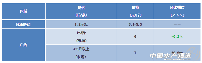 中國水產頻道原創報道,廣西區域:目前叉尾凍廠開工很少,叉尾主要走市場為主,1-3斤/尾規格下滑0.2元,3-5斤市場平穩。