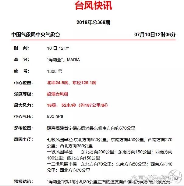 最高級別!中央氣象臺發布首個臺風紅色預警 據中央氣象臺消息:這是臺風預警最高級別,也是今年來中央氣象臺發布的首個紅色預警! 目前,超強臺風“瑪莉亞”現已進入我國24小時警戒線,這意味著臺風24小時內對我國將有顯著影響,并可能于24小時內登陸,防臺壓力越來越大! 國家防總啟動應急響應 圖為10日上午10時葵花8號衛星捕捉到的臺風“瑪莉亞”,臺灣部分外圍甩臂已觸達臺灣 臺風“瑪莉亞”的中心10日上午10點鐘位于福建霞浦東偏南方約730公里的西北太平洋洋面上,就是北緯24.3度,東經126.7度,中心附近最大風力有16級(52米/秒),中心最低氣壓為935百帕,七級風圈半徑270-550公里,十級風圈半徑100-200公里,十二級風圈半徑40-70公里。 預計,“瑪莉亞”將以每小時30公里左右的速度向西偏北方向移動,將于11日凌晨掠過臺灣島北部,并于11日上午在福建福清到浙江蒼南一帶沿海登陸(強臺風級,14-15級,42-48米/秒),登陸后向西北方向移動,穿過福建北部,強度迅速減弱,將于11日晚上移入江西東部,隨后減弱為熱帶低壓。 大風預報:10日14時至11日14時,臺灣以東洋面、東海南部、臺灣海峽北部、福建沿海、臺灣沿海、浙江沿海的風力將逐漸加大到7-10級,其中東海南部偏南海域、臺灣東北部洋面、臺灣北部沿海、福建東北部沿海、浙江東南部沿海的風力可達11-12級,“瑪莉亞”中心經過的附近海面或地區的風力有13-16級,陣風17級。 降水預報:10日14時至11日14時,浙江東部和南部、福建中北部、臺灣島中北部有大雨或暴雨,其中,福建東北部、浙江東南部、臺灣島北部等地的部分地區有大暴雨、局地特大暴雨(250-300毫米)。 鑒于“瑪莉亞”路徑北抬,受臺灣北部地形的消減作用趨弱,臺風將正面襲擊福建。 其特點為登陸強度強、內陸及臨海地區起風時間快,帶來的影響今天就會從臺灣北部、浙江和福建沿海展開,不過11日才是影響最為劇烈和集中的時段,尤其是在登陸點附近,將面臨特大暴雨和14級及以上的瞬時大風。 預計11日05-08時福建東部地區風力將迅速達到8級及以上,陣風11~13級。降雨時間和區域集中,福建寧德、福州、平潭、三明、莆田、南平,浙江溫州、麗水、臺州等地為暴雨集中區,會達到大暴雨局部特大暴雨量級。 據統計,1949-2017年來,登陸福建臺風共103個,級別上來看,多以臺風以上級別居多。登陸上來看福建臺風多以二手臺風為主,103個登陸臺風中,直接登陸的只有36個。 目前來看“瑪莉亞”有望成7月登陸福建最強臺風,不排除以超強臺風登陸,此前登陸最強的是在浙閩沿海登陸的2006年8號臺風桑美,達到60米每秒的風速。 兇猛!最大風力17級的“瑪莉亞”移速快、強度強 據臺風監測消息:在副熱帶高壓南側氣流的引導下,超強臺風“瑪莉亞”以接近30公里每小時的速度向西偏北方向快速移動。7月10日上午,“瑪莉亞”穿過我國臺風24小時警戒線,即將進入我國東海東南部海域,登陸已進入倒計時。 超強臺風“瑪莉亞”今早開始已經能被沖繩島上的嘉手納空軍基地雷達偵測到 各大官方臺風預報機構、數值預報模式對“瑪莉亞”路徑預報意見趨于一致:“瑪莉亞”很有可能于今天(10日)夜里擦過臺灣北部,并于明天(11日)上午在福建中北部到浙江南部沿海地區登陸。目前預計最有可能的登陸地點是福建寧德沿海地區。 需要注意的是,“瑪莉亞”在擦過臺灣北部前后,受山脈地形的影響,臺風中心可能出現一定程度的南折。因此,“瑪莉亞”的最終登陸位置仍存在一定的變數。 NCEP、ECMWF集合預報模式以及中央氣象臺近期發布的“瑪莉亞”路徑概率預報圖。 葵花-8號衛星記錄下的超強臺風"瑪莉亞"達到巔峰強度時中心附近動態云圖。 西北太平洋及我國南海海域當前海溫狀況。 “瑪莉亞”在8日早晨再度進入暖水區后強度再度增強,至9日上午達到其巔峰強度60米/秒。9日傍晚開始,“瑪莉亞”再度進入一個海溫相對較冷的區域,中心附近最大風速逐漸減弱到52米/秒。未來幾小時,“瑪莉亞”將穿過琉球群島附近的黑潮區后進入我國東海東南部。在途經黑潮區時受當地較暖海溫的影響,“瑪莉亞”強度或有可能短時增強,而當完全進入東海后,受東海較冷水域和臺風中心南側臺灣地形的影響,強度將可能減弱到強臺風或超強臺風下限。 “桑美”和各機構預報的“瑪莉亞”后期路徑對比。(底圖源自溫州臺風網) 0608號超強臺風“桑美”進入東海后直至登陸時的紅外云圖動畫 美國颶風模式(HWRF)9日20時模擬的“瑪莉亞”后期10米高度處風場演變圖 “瑪莉亞”的路徑與2006年第8號超強臺風“桑美”的路徑有幾分相似。雖然目前預報的“瑪莉亞”在登陸前的強度可能為強臺風級,與“桑美”60米/秒的登陸強度有一定的差距,但是“瑪莉亞”的個頭卻遠大于“桑美”,影響范圍也將會比“桑美”更大。 “瑪莉亞”與“桑美”進入東海前后的個頭對比 萬分警惕!“瑪莉亞”破壞力超強 據氣象專家介紹,臺風“瑪莉亞”具有強度強、發展快、移動速度快,登陸強度強等特點。目前,“瑪莉亞”以每小時30公里左右的速度快速向我國逼近,其未來路徑很大可能繞過臺灣,直接登陸閩浙。這樣臺風內核區會避開臺灣地形對其的破壞,登陸時強度會很強。另外,經過臺灣島前后,“瑪莉亞”將有可能出現“瘦身”,甩開外圍云系,成為個頭小但破壞力十足的微型臺風。 專家特別提醒,“瑪莉亞”的強