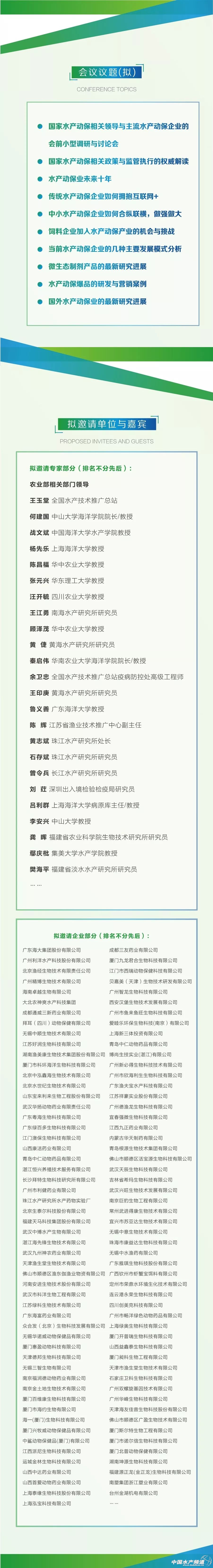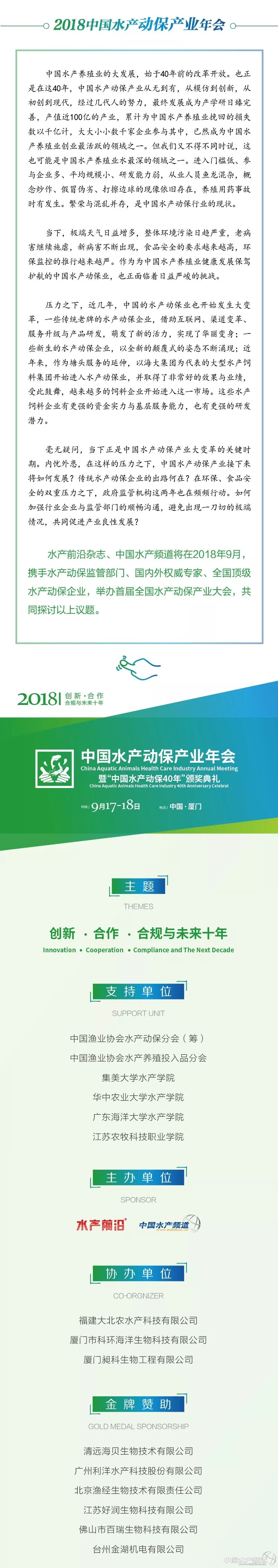 中國水產(chǎn)頻道報(bào)道, 2018中國水產(chǎn)動保產(chǎn)業(yè)年會 2018 China Aquatic Animals Health Care Industry Annual Meeting 暨“中國水產(chǎn)動保40年”頒獎典禮 China Aquatic Animals Health Care Industry 40th Anniversary Celebratio 主題:創(chuàng)新·合作·合規(guī)與未來十年 Themes: Innovation Cooperation Compliance and The Next Decade 9月17-18日 (17日全天報(bào)到) 福建·廈門 贊助聯(lián)系 業(yè)內(nèi)知名企業(yè)如有意贊助,敬請聯(lián)系: 揭小麗:13719331127 張玉梅:18675898952 劉 欣:13728001916 參會報(bào)名 1、注冊費(fèi): 現(xiàn)場注冊繳費(fèi):2000元/人; 8月10日前注冊繳費(fèi),8折優(yōu)惠,1600元/人; 9月15日前注冊繳費(fèi),9折優(yōu)惠,1800元/人。 注冊費(fèi)含資料費(fèi)、餐費(fèi)以及相關(guān)會議活動費(fèi)用,交通住宿自理(注:報(bào)名成功后因個(gè)人原因不能參加的,費(fèi)用恕不退還;住宿及往返車費(fèi)自理)。 2、報(bào)名注冊: 1)掃描以下二維碼注冊 2)短信報(bào)名注冊 編輯短信“動保+姓名+電話+單位”發(fā)送到手機(jī)13809826267,聯(lián)系人:彭曉君 花絮 中國漁業(yè)協(xié)會水產(chǎn)養(yǎng)殖投入品分會 江蘇省水生動物疫病預(yù)防控制中心 江蘇農(nóng)牧科技職業(yè)學(xué)院 江蘇好潤生物科技有限公司 江蘇祥豪實(shí)業(yè)股份有限公司 無錫三智生物科技有限公司 宜興市蘇亞達(dá)生物技術(shù)有限公司 愛睦樂環(huán)保生物技術(shù)(南京)有限公司 上海泓寶綠色水產(chǎn)科技發(fā)展有限公司 北京中泓鑫海生物技術(shù)有限公司 南京金土地生物技術(shù)有限公司 浙江金大地生物工程股份有限公司 江蘇省倉東農(nóng)業(yè)發(fā)展有限公司 博尚生技實(shí)業(yè)(湛江)有限公司 廣東綠百多生物開發(fā)有限公司 |
