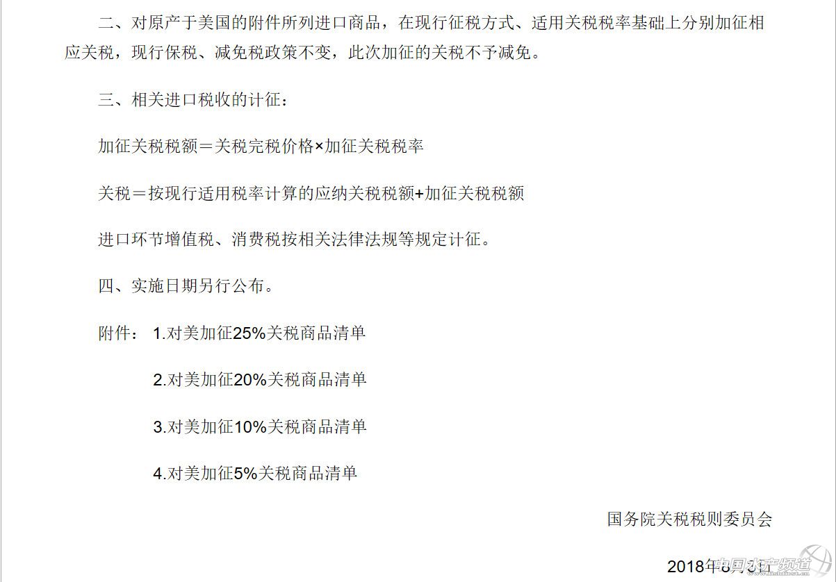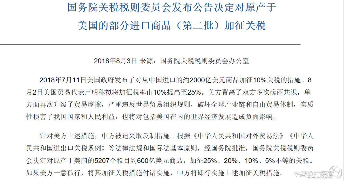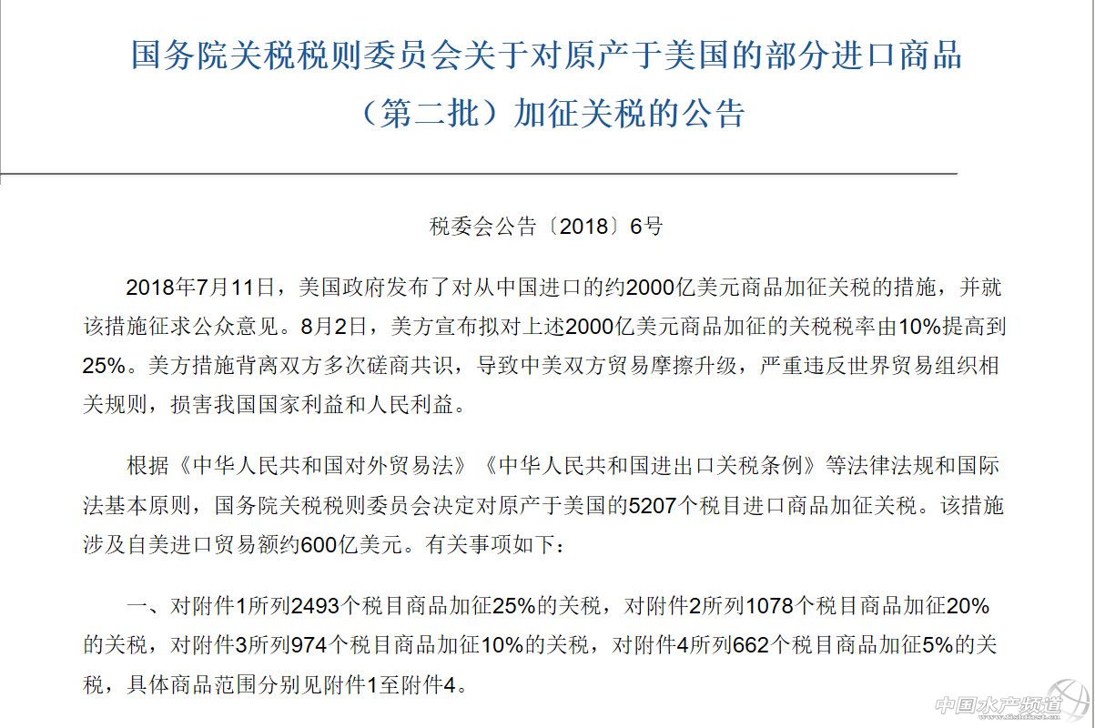 中國水產頻道綜合整理報道, 8月3日,中國宣布決定對原產于美國的5207個稅目進口商品加征關稅。該措施涉及自美進口貿易額約600億美元。 6月15日,美國政府發布了加征關稅的商品清單,將對從中國進口的約500億美元商品加征25%的關稅。 6月16日,國務院關稅稅則委員會決定對原產于美國的659項約500億美元進口商品加征25%的關稅,其中545項約340億美元商品自2018年7月6日起實施加征關稅. 美國東部時間7月6日凌晨,美國對來自中國的818種、340億美元金額產品加征25%關稅。 北京時間7月6日中午12時起,中國對原產美國的農產品、汽車、水產品等545項商品,規模總計340億美元的進口商品加征25%關稅。 據央視新聞客戶端消息,2018年7月11日,美國政府發布了對從中國進口的約2000億美元商品加征10%關稅的措施。8月2日,美國貿易代表聲明稱擬將加征稅率由10%提高至25%。美方背離了雙方多次磋商共識,單方面再次升級了貿易戰,嚴重違反世界貿易組織規則,破壞全球產業鏈和自由貿易體制,實質性損害了我國國家和人民利益,也將對包括美國在內的世界經濟發展造成負面影響。 針對美方上述措施,中方被迫采取反制措施。根據《中華人民共和國對外貿易法》《中華人民共和國進出口關稅條例》等法律法規和國際法基本原則,經國務院批準,國務院關稅稅則委員會決定對原產于美國的5207個稅目約600億美元商品,加征25%、20%、10%、5%不等的關稅。如果美方一意孤行,將其加征關稅措施付諸實施,中方將即行實施上述加征關稅措施。 附件 原文注:商品名稱僅供參考,具體商品范圍以2018年《中華人民共和國進出口稅則》中的稅則號列對應的商品范圍為準。 編者注:因附件2、附件4未涉及水海產品,本文未列出; 附件3中“第三章”指魚、甲殼動物,軟體動物及其他水生無脊椎動物,稅則號列以03開頭。 商務部新聞發言人發表談話 商務部新聞發言人表示,中方的差別化稅率反制措施是理性和克制的,是在廣泛聽取意見、認真評估影響后提出的,特別是充分考慮了人民的福利、企業的承受力和維護全球產業鏈運轉等因素。征稅措施的實施日期將視美方行動而定,中方保留繼續出臺其他反制措施的權利。中方始終認為,在相互尊重、平等互利的原則基礎上進行協商,才是解決貿易分歧的有效途徑,任何單邊的威脅或訛詐只會導致矛盾激化,損害各方利益。 中方再次強調,由于美方不顧雙方企業和消費者利益,一再升級事態,中方不得不采取必要的反制措施,以捍衛國家尊嚴和人民利益,捍衛自由貿易和多邊體制,捍衛世界各國共同利益。 不管美方怎么折騰,中國的決心沒有變,將繼續按照既定部署,堅定不移地推進改革開放。根據剛剛召開的中央政治局會議,中國將繼續落實擴大開放、大幅放寬市場準入的重大舉措,推動共建“一帶一路”向縱深發展,精心辦好首屆中國國際進口博覽會,繼續堅定不移地將改革開放推進下去。會議還強調,保護在華外資企業合法權益。開放的中國愿與世界各國一道,堅定不移地維護自由貿易原則和多邊貿易體制。(本段選自《美國威脅施壓達不到目的》新華社) 水產企業需積極應對貿易戰 關于中美貿易戰相關文章網上已經很多,國家層面、戰略層面的分析都有。現在,我們撇開這些高大上的言論,就來分析下我們水產行業如何應對,普通的出口企業應該怎么辦。 從近幾十年來中國海產市場快速發展歷程來看,這個巨大的消費市場從來不缺供應方,一些貿易代表表示如果美國失去中國市場,那么其份額將很快被其他國家所占領,這種情況是有先例的,而且一旦失去市場準入那么在進入就很難。 據統計,根據國家海洋漁業服務管理局(NMFS)數據,中國是美國第二大海產品供應國,僅次于加拿大。2017年中國對美國海產品出口額達27億美元,加拿大對美國海產出口額為33億美元。 2017年在美國進口中國水產品中,羅非魚以4.26億美元排名第一,其次是蝦類產品進口額為3.35億美元。 轉載聲明 本文轉自【新華社、中華人民共和國財政部、證券時報、每日經濟新聞、海鮮指南、食材交易會】。如有版權問題,敬請聯系wx@fishfirst.cn。 【關鍵字】:貿易戰 中國 美國 水產養殖 |