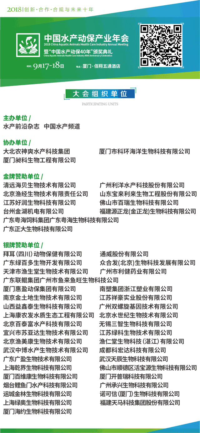 中國水產(chǎn)頻道報道,水產(chǎn)前沿雜志、中國水產(chǎn)頻道攜手水產(chǎn)動保監(jiān)管部門、國內(nèi)外權(quán)威專家、全國頂級水產(chǎn)動保企業(yè),將于9月17-18日舉辦首屆全國水產(chǎn)動保產(chǎn)業(yè)大會。會議期間,將同時舉辦“中國水產(chǎn)動保40年”頒獎典禮。 2018中國水產(chǎn)動保產(chǎn)業(yè)年會 2018 China Aquatic Animals Health Care Industry Annual Meeting 暨“中國水產(chǎn)動保40年”頒獎典禮 China Aquatic Animals Health Care Industry 40th Anniversary Celebration 主題:創(chuàng)新·合作·合規(guī)與未來十年 Themes: Innovation Cooperation Compliance and The Next Decade 2018年9月17-18日 大咖云集,共襄盛舉 福建廈門,不見不散 酒店 福建·廈門佰翔五通酒店 地址:福建省廈門市胡里區(qū)環(huán)島東路2496號 會議廳 17日中國水產(chǎn)動保圓桌會議:酒店二樓格致廳 18日正式會議:酒店二樓中國匯廳 簽到 會議實名制簽到并領(lǐng)取會議資料每人/份 提前簽到:17日9:00-18:00,地點:酒店一樓大堂 當天簽到:18日上午7:45-9:00,地點:酒店二樓中國匯廳 進場 17日圓桌論壇的入場券請在簽到處登記領(lǐng)取 18日憑嘉賓證進場(簽到時登記領(lǐng)取,請妥善保管) 入住 在簽到處報到登記領(lǐng)取房號,憑有效身份證件到酒店前臺取房入住(需提前向會務(wù)組訂房) 用餐 早餐由入住酒店供應(yīng)(僅限住房客人) 17日晚餐時間:18:00,地點:酒店三樓格瀾廳和格物廳 18日午餐時間:12:00,地點:酒店一樓恰恰餐廳 18日晚餐時間:18:45,地點:酒店二樓中國匯廳 (請妥善保管餐券,丟失概不重發(fā)) 停車 酒店設(shè)有免費停車位,請停到指定位置 天氣 今天凌晨2點10分前后,山竹已在菲律賓呂宋島東北部沿海登陸,登陸時中心附近最大風力17級以上(65米/秒),中心最低氣壓910百帕。 預(yù)計,“山竹”即將于今日中午前后進入南海東部海面,并將于16日下午到夜間在廣東臺山到徐聞一帶沿海登陸(14~16級,45~52米/秒,強臺風級或超強臺風級),以后繼續(xù)向西偏北方向移動,強度逐漸減弱。由于“山竹”影響范圍極大,未來它的大風圈將覆蓋整個廣東和海南東部沿海地區(qū),而未來處于登陸點北側(cè)的珠江口附近地區(qū)將處于它正面襲擊的10級風圈危險半徑范圍內(nèi)。 溫馨提醒:請廣東、海南參會代表注意天氣變化,提前規(guī)劃好行程。出行方式建議以高鐵、動車等陸地交通為主,避免天氣對航班的影響。 一、組織單位 二、會議日程 同期活動 2018年9月17-18日,在廈門舉辦的“2018中國水產(chǎn)動保產(chǎn)業(yè)年會”,同期將舉行隆重的頒獎典禮。 誰是中國水產(chǎn)動保40年發(fā)展的功勛人物和企業(yè)?誰是中國水產(chǎn)動保產(chǎn)業(yè)最具創(chuàng)新力與發(fā)展?jié)摿Φ钠髽I(yè)?2018中國水產(chǎn)動保產(chǎn)業(yè)年度人物和企業(yè)獎項究竟花落誰家? 三、酒店與路線參考 四、報名與聯(lián)系 1、注冊費: 現(xiàn)場注冊繳費:2000元/人 注冊費含資料費、餐費以及相關(guān)會議活動費用,交通住宿自理(注:報名成功后因個人原因不能參加的,費用恕不退還;住宿及往返車費自理)。 2、報名注冊: 1)掃描以下二維碼注冊 2)短信報名注冊 編輯短信“動保+姓名+電話+單位”發(fā)送到手機13809826267,聯(lián)系人:彭曉君 【關(guān)鍵字】:動保 動保企業(yè) 水產(chǎn)養(yǎng)殖 |
