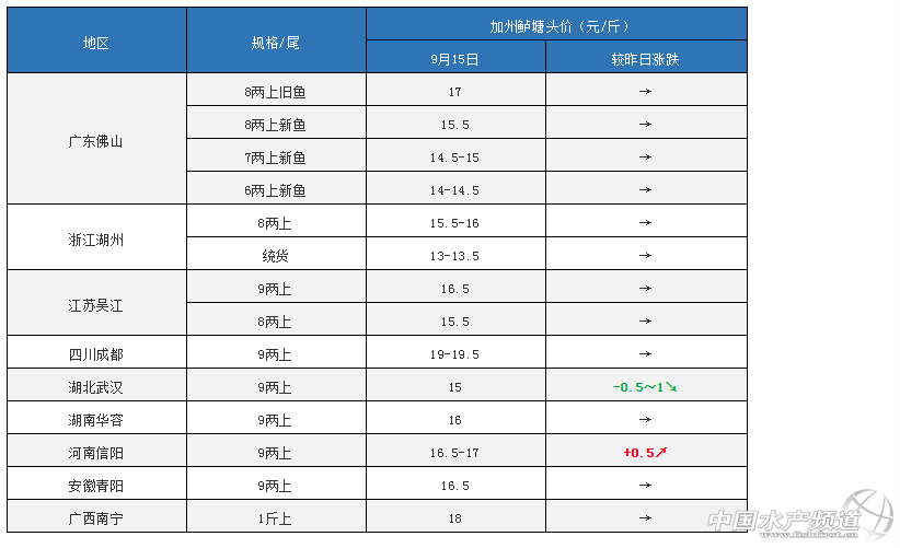 今日加州鱸價一覽 注:上述價格及行情分析僅供參考,市場有風險,入市需謹慎。 產區加州鱸塘頭價及行情簡析 華南地區 中國水產頻道原創獨家報道,廣東佛山:今天佛山8兩上加州鱸舊魚報價17元/斤,這個價格從7月28日開始已持穩了50天;新魚報價6兩上14-14.5元/斤,7兩上14.5-15元/斤,8兩上15.5元/斤,實際價格看魚頭和魚的大小比例有浮動。擔心國慶后魚價下跌,現在養戶出新魚的積極性很高,出魚量有所增多。 廣西南寧:今天報價18元/斤,目前魚價也持穩已久,當地老口鱸魚存塘不多,由于廣東魚價較便宜,流通商多到廣東拉魚,預計等廣東新魚大量上市后,后期價格會有所調整。 華東地區 浙江湖州:今天報價8兩上15.5-16元/斤,統貨報價13-13.5元/斤。目前湖州地區基本沒有挑標魚,大多出統貨,據當地魚中介紹,近期湖州市場需求量不大、賣不動,預計魚價短期內趨于穩定。 江蘇吳江:今天報價8兩上15.5元/斤,9兩上16.5元/斤,吳江地區老口鱸魚還有一定存塘,受廣東新魚陸續北運影響,流通商到吳江的收魚量有所減少,吳江當地養戶還在排隊出魚。 安徽青陽:今天報價9兩上16.5元/斤,據悉,青陽地區老口鱸魚存塘量已經不多,部分還有存塘的養戶想等國慶再清塘。 華中地區 湖北武漢:今天報價9兩上15-16元/斤,下跌了0.5-1元/斤。武漢的老口存塘已經不多,但近來廣東新魚進入武漢市場的量增多,本地魚價受到了一定沖擊。 湖南華容:今天報價9兩上16元/斤,從當地養戶和魚中得知,受廣東新魚沖擊當地市場影響,湖南魚價已有下跌趨勢,暫時持穩。 河南信陽:今天報價9兩上16.5-17元/斤,上漲了0.5元/斤。據了解,信陽老口鱸魚已經不多,當地魚中忙著找魚,部分塘口魚價有所上調。 西南地區 四川成都:今天報價9兩上19-19.5元/斤,這個價格已經企穩了兩個多月。四川地區的老口鱸魚所剩不多,從新津縣某加州鱸養殖合作社負責人得知,近一周來新津已有部分新口上市,9兩上規格19元/斤。 注:上述價格及行情分析僅供參考,市場有風險,入市需謹慎。 |