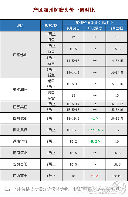 文/圖 水產(chǎn)前沿 李曉欣 廣東佛山:魚價企穩(wěn),中秋銷量或走俏 今天報價舊魚8兩以上17元/斤,本周以來魚價持穩(wěn);新魚報價6兩以上14-14.5元/斤,7兩以上14.5-15元/斤,8兩以上15.5元/斤,主要看魚頭以及8兩以上的比例來定價。 目前舊魚主要在沙頭區(qū)域,還有幾十塘左右,現(xiàn)在每天出魚量不大,預(yù)計月底才能出完。順德以出新魚為主,但量還不算大,價格比較穩(wěn)定。中秋即將到來,銷量將有所提高,但目前新魚、老魚都還能滿足市場需求,預(yù)計魚價以持穩(wěn)為主。 浙江湖州:少量新魚上市,半月后或迎高峰 今天報價8兩上15.5-16元/斤,統(tǒng)貨報價13元/斤,魚價一周持平。湖州地區(qū)老口魚已經(jīng)基本出完,還有存塘魚的大多出統(tǒng)貨。個別養(yǎng)殖戶已經(jīng)開始出新口鱸魚,但是成數(shù)不高,預(yù)計半月之后湖州地區(qū)新口鱸魚將迎來首次上市高峰。 江蘇吳江:上漲乏力,老口月底售空 今天吳江8兩上報價15.5元/斤,9兩上報價16.5元/斤,本周以來價格持穩(wěn)。吳江還有一定老口存塘,從現(xiàn)在每天的出魚量和存塘量來看,預(yù)計老口鱸魚到月底才能出完。而國慶前后會有部分新口鱸魚上市,魚價上漲較為乏力。 四川成都:新魚開始上市,跌幅1元/斤 今天老口魚價格9兩上18-18.5/斤,四川19-19.5元/斤的價格自6月25日開始企穩(wěn)了將近3個月,昨日(19日)下跌至18-18.5/斤,跌幅達1元/斤。 據(jù)悉,四川當(dāng)?shù)匦卖~已開始上市,擔(dān)心舊魚價格受到?jīng)_擊,還有老口魚的養(yǎng)殖戶積極出魚。另外,四川地區(qū)的網(wǎng)箱清拆工作還在繼續(xù),要趕在年底前清拆完,加速了養(yǎng)殖戶賣魚,出魚量大,魚價有所下降。 湖北武漢:廣東新魚沖擊市場,大跌1.5元/斤 今天報價9兩上15元/斤,相比上周價格下跌了1-1.5元/斤。武漢的老口存塘已經(jīng)不多,但近來天氣轉(zhuǎn)涼,廣東新魚進入武漢市場的量增多,本地魚價受到了一定沖擊。 湖南華容:略跌0.2元/斤,養(yǎng)戶觀望價格 今天報價9兩上16元/斤,相比上周魚價下跌了0.2元/斤。從當(dāng)?shù)仞B(yǎng)戶和魚中得知,受廣東新魚沖擊當(dāng)?shù)厥袌鲇绊,湖南魚價略微下跌。臨近中秋,當(dāng)?shù)仞B(yǎng)戶都在觀望價格。 安徽青陽:存塘減少,養(yǎng)戶待價惜售 今日報價9兩上16.5元/斤,本周魚價保持不變。青陽老口鱸魚的存塘所剩不多,還有存塘的養(yǎng)戶想等中秋、國慶再出魚,最近出魚量不大。 河南信陽:漲了又跌,新魚開始上市 今天報價9兩上16.5元/斤,本周以來信陽魚價漲了又跌,在16.5-17元/斤的范圍浮動。信陽老口鱸魚已經(jīng)不多,目前已有少部分新魚開始上市,預(yù)計國慶前后將迎來新魚上市小高峰,魚價上漲機會不大。 廣西南寧:臺風(fēng)運魚受阻,上漲1元/斤 今天報價18-19元/斤,相比上周魚價上漲了1元/斤。受風(fēng)王“山竹”影響,廣東魚難以進入廣西市場,部分塘口價格上漲至19元/斤,但預(yù)計不久后魚價又將下調(diào)。 【關(guān)鍵字】: 湖北加州鱸 2018年 加州鱸價格行情 水產(chǎn)養(yǎng)殖 |