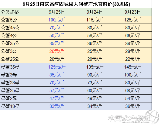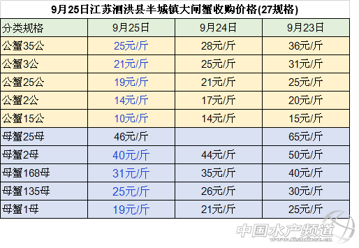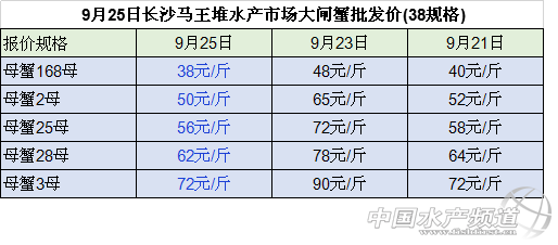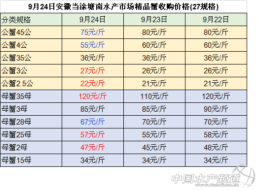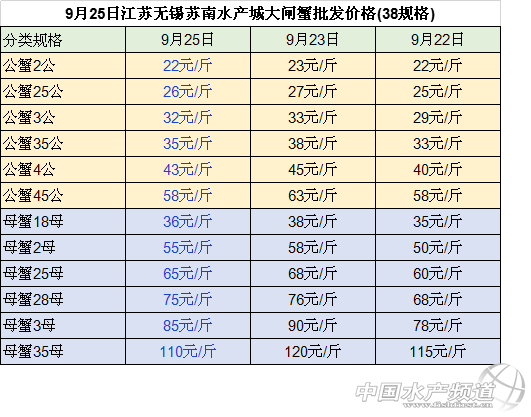 中國水產頻道整理報道,2018年9月25日南京高淳固城湖大閘蟹產地直銷價大部分價格下跌,最高下跌15元/斤。江蘇無錫蘇南水產城河蟹批發公蟹和母蟹價格均小幅下跌。江蘇常州凌家塘水產市場大閘蟹批發價格有漲有跌。江蘇泗洪縣半城鎮大閘蟹收購價格下跌。長沙馬王堆水產市場大閘蟹批發母蟹價格均小幅下跌。具體如下: 今日南京高淳固城湖大閘蟹產地直銷價大部分價格下跌:與昨日相比: 公蟹:5公、45公、4公、35公價格下跌,分別下跌15元/斤、10元/斤、8元/斤、1元/斤,3公的價格上漲了1元/斤,25公的價格保持不變; 母蟹:價格均下跌,35母、3母、28母、25母、2母和18母的價格分別下跌10元/斤、5元/斤、3元/斤、3元/斤、2元/斤和1元/斤 今日江蘇無錫蘇南水產城河蟹批發價格:與昨日相比,公蟹和母蟹價格均小幅下跌:其中, 公蟹:2公、25公和3公的價格均下跌1元/斤、35公的價格下跌3元/斤、4公的價格下跌2元/斤,45公的價格下跌5元/斤 。 母蟹:18母的價格下跌2元/斤,2母和25母的價格均下跌3元/斤、28母的價格下跌1元/斤、3母的價格下跌5元/斤、35母的價格下跌10元/斤。 今日江蘇常州凌家塘水產市場大閘蟹批發價格有漲有跌:做昨日相比: 公蟹:2公和25公、3公的價格上漲,分別上漲4元/斤、2元/斤和9元/斤,4公的價格分別下跌10元/斤; 母蟹:母蟹的價格均下跌:18母和2母的價格分別下跌3元/斤和5元/斤,25母的價格下跌7元/斤,3母的價格下跌25元/斤。 今日江蘇泗洪縣半城鎮大閘蟹收購價格下跌 :與昨日相比, 公蟹:3.5公和2公的價格小幅下跌,均下跌3元/斤,3公和15公的價格均下跌4元/斤,25公的價格價格下跌2元/斤。 母蟹:25母的價格保持不變,2母、168母、135母、1母價格均下跌,分別下跌4元/斤、4元/斤、1元/斤、2元/斤。 今日長沙馬王堆水產市場大閘蟹批發價均小幅下跌:與昨日相比, 168母蟹、2母蟹、25母蟹和28母蟹、3母的價格分別下跌10元/斤、5元/斤、6元/斤、16元/斤、18元/斤。 9月24日安徽當涂塘南水產市場精品蟹收購價格漲跌不一:與23日相比: 公蟹:45公、4公的價格下跌,均下跌5元/斤,35公的價格保持不變,3公和2.5公的價格上漲,均上漲1元/斤; 母蟹:35母、25母和2母的價格均上漲,分別上漲10元/斤、2元/斤和2元/斤,28母的價格下跌了3元/斤,3母和15母的價格保持不變。 數據來源于中國水產養殖網 |