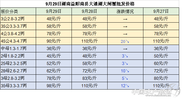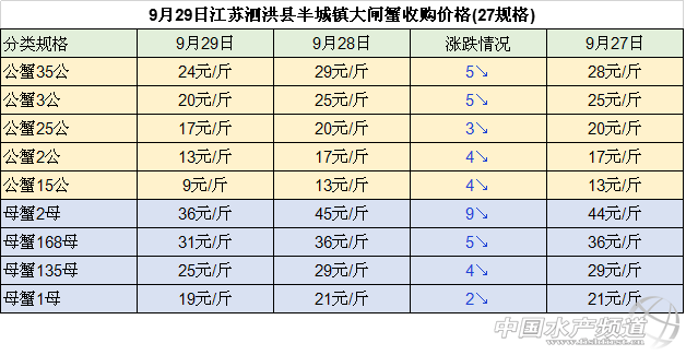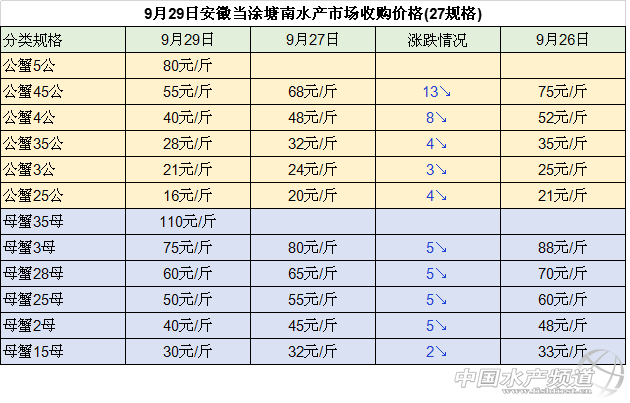 中國水產頻道整理報道,2018年9月29日江蘇無錫蘇南水產城河蟹批發價格穩中有漲,江蘇泗洪縣半城鎮大閘蟹收購價格明顯下跌,安徽當涂塘南水產市場河蟹收購價格大幅下跌,湖南益陽南縣大通湖大閘蟹批發價格穩中有跌,具體如下: 今日江蘇常州凌家塘水產市場大閘蟹批發價格與27日相比均下跌:其中, 公蟹:2公、25公、35公、4公、45公價格均下跌2元/斤,3公的價格下跌3元/斤。 母蟹:18母和25母的價格下跌2元/斤,2母的價格均下跌4元/斤,28母和3母的價格均下跌3元/斤,35母的價格下跌10元/斤,價格為100元/斤。 今日江蘇無錫蘇南水產城河蟹批發價格穩中有漲: 公蟹:2公、25公、3公的價格均保持不變,35公、4公和45公的價格均上漲1元/斤。 母蟹:18母、2母、25母、28母、3母的價格均上漲1元/斤,35母的上漲5元/斤,價格為110元/斤。 今日江蘇泗洪縣半城鎮大閘蟹收購價格下跌明顯: 公蟹:35公和3公的價格均下跌5元/斤,25公的價格下跌3元/斤,2公和15公的價格均下跌4元/斤。 母蟹:2母的價格下跌9元/斤,168母的價格下跌5元/斤、135母的價格下跌4元/斤,1母的價格下跌2元/斤。 今日安徽當涂塘南水產市場河蟹收購價格大幅下跌: 公蟹:5公的價格為80元/斤,45公的價格下跌13元/斤,4公的價格下跌8元/斤,35公和25公的價格均下跌4元/斤,3公的價格下跌3元/斤; 母蟹:35母的價格為110元/斤,3母、28母、25母和2母的價格均下跌5元/斤,15母的價格下跌2元/斤。 今日湖南益陽南縣大通湖大閘蟹批發價格較昨日相比穩中有跌 : 公蟹:3公、35公和4公的價格均保持不變,45公的價格大幅下跌,下跌了 20元/斤; 母蟹:1.3-1.7兩 母蟹的價格保持不變,2母和25母的價格下跌3元 /斤,28母 的價格下跌10元/斤,3母的價格下跌5元/斤,35母的價格下跌12元/斤,價格為98元/斤。 數據來源于中國水產養殖網 |