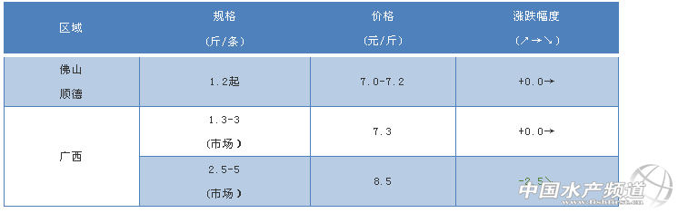 中國水產頻道原創報道, 文/ 水產前沿 植銀素 叉尾鮰 廣西區域:目前叉尾量少導致凍廠開工不足,收購價難以與市場價看齊,叉尾以走市場為主。雖然國慶臨近,但近期迎來了第二波網箱限期拆除到期的影響,部分大規格叉尾積壓拋售,大規格叉尾價格暴跌2.5元。(塘養的小規格叉尾價格尚未受影響) 佛山順德區域:本周魚價穩定,主要發生病害:出血,爛鰓,腸胃。 【關鍵字】:叉尾鮰 塘頭價 水產養殖 |