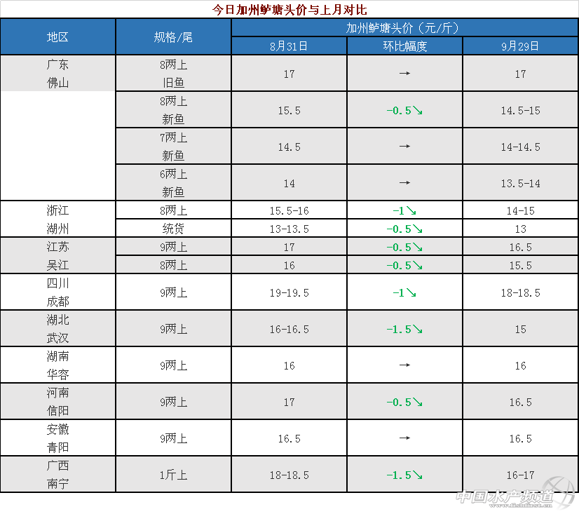 三分鐘掌握各產區加州鱸9月行情 文/圖 水產前沿 李曉欣 9月,各產區加州鱸塘頭價穩中有降,部分產區下滑嚴重。其中,湖北武漢和廣西南寧下跌1.5元/斤,浙江湖州、江蘇吳江、河南信陽三地下跌0.5-1元/斤不等,而廣東佛山、湖南華容、安徽青陽三地魚價保持平穩。 9月各產區行情簡析 廣東佛山:舊魚即將售空,新魚同比高1元/斤 本月廣東佛山8兩上舊魚價格保持平穩,今天報價依然為17元/斤,這個價格從7月28日開始企穩了超兩個月。去年9月,8兩上舊魚價格最高達22元/斤,舊魚在9月中下旬早已售空。今年9月,佛山還有存塘舊魚的養戶都在積極出魚,目前順德區域已基本出完,南海沙頭還有幾塘舊魚,每天的出魚量不大,預計十月上旬可以全部出完。 新魚今天報價6兩上14元/斤,7兩上14.5元/斤,8兩上15.5元/斤。本月新魚上市的量有所增多,不過還未到高峰,魚價有小幅浮動,但整體影響不大。去年9月,6兩新魚由于大量上市,從月初的17-17.5元/斤暴跌至13元/斤,現在6兩新魚的價格相比去年同期高出1元/斤。國慶即將到來,屆時市場銷量將有所增加,但目前新老魚的存塘量還能滿足市場需求,預測短期內魚價以持穩為主 浙江湖州:跌幅0.5-1元/斤,少量新魚上市 今天報價統貨13元/斤,相比上月13-13.5元/斤下跌了0.5元/斤;8兩上報價14-15元/斤,相比上月15.5-16元/斤下跌了1元/斤。目前湖州地區老口鱸魚已經不多,當地流通商多就近到吳江拉魚,受吳江魚價下跌影響,湖州魚價也有所下跌。當地還是以出統貨為主,有部分新口鱸魚統貨上市。 江蘇吳江:下跌0.5元/斤,老口十月底出完 今天吳江8兩上報價15.5元/斤,9兩上報價16.5元/斤。本月6日,吳江8兩上、9兩上加州鱸分別下跌了0.5元/斤。吳江地區老口鱸魚還有一定存塘,擔心國慶后魚價下跌,部分養戶在找賣魚渠道,有排隊出魚現象,預計十月底老口鱸魚才能出完,魚價上漲較為乏力。 四川成都:新魚開始上市,魚價下跌1元/斤 今天四川9兩上老口鱸魚報價18-18.5/斤。本月,四川企穩近三個月的價格迎來了下跌,從19-19.5元/斤下跌至18-18.5元/斤,跌幅1元/斤。此次魚價下跌,一方面是四川當地新魚準備上市,擔心魚價受到沖擊,還有存塘老口魚的養殖戶抓緊時間出魚。另一方面,四川地區的網箱清拆工作還在繼續,趕在年底前清拆完,加速了養殖戶賣魚,對魚價也有所影響。目前四川新口鱸魚已經陸續上市,因規格比老口小,9兩上報價18元/斤左右,實際價格因應魚的整體規格而定。 湖北武漢:廣東新魚沖擊市場,大跌1.5元/斤 今天報價9兩上15元/斤。本月中旬,受廣東新魚沖擊市場影響,武漢魚價2次下調,從16-16.5元/斤下跌至15元/斤 ,跌幅高達1.5元/斤。擔心國慶后魚價大幅下跌,武漢部分養戶在趕著國慶出頭批魚,加上廣東新魚進入武漢市場的量逐漸增多,預計魚價上漲希望不大。 湖南華容:中秋銷量走俏,魚價持穩 今天報價9兩上16元/斤,本月湖南魚價浮動不大。中秋期間華容當地銷量大幅增加,其中23日總出魚量達9萬斤,比平常增加了4萬斤左右。據當地收購商介紹,當地存塘魚必須賣的已經賣得差不多了,預計魚價短期內下跌可能性不大,將保持平穩。 安徽青陽:存塘量不多,魚價平穩運行 今天報價9兩上16.5元/斤,本月青陽魚價平穩運行。經過8月下旬和9月上旬的大量出魚,9月中旬開始青陽當地老口存塘已經不多,還有存塘的養戶想等中秋和國慶出魚,預計國慶后老口存塘將減少到1成左右。當地的新口鱸魚距離上市還有2-3個月,預計魚價或有上漲空間。 河南信陽:小跌0.5元/斤,新口陸續上市 信陽今天9兩上老口鱸魚報價16.5元/斤,本月信陽魚價從17元/斤下降至16.5元/斤,跌幅0.5元/斤。目前,當地新口鱸魚開始陸續上市,9兩起步14.5元/斤。部分養戶擔心國慶后魚價下跌嚴重,在找尋賣魚渠道,出魚積極性高。 廣西南寧:廣東新魚沖擊市場,大跌2元/斤 今天1斤上加州鱸報價16-17元/斤,本月廣西魚價波動較大,9月中旬受風王“山竹”影響,廣東新魚難以進入本地市場,廣西魚價從18-18.5元/斤上漲至18-19元/斤,漲幅0.5元/斤;但上漲不久,南寧本地魚價下降至16-17元/斤,跌幅2元/斤。目前南寧老口存塘不足1成,但隨著廣東新魚大量上市,預計魚價上漲希望不大。 注:上述價格及行情分析僅供參考,市場有風險,入市需謹慎。 |