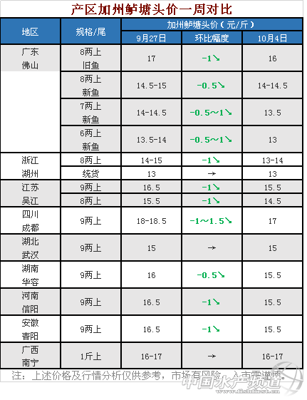 文/圖 水產(chǎn)前沿 李曉欣 受國慶節(jié)日效應(yīng)影響,本周多地加州鱸銷量走俏,但銷量的增加未能拉動(dòng)魚價(jià),多產(chǎn)區(qū)加州鱸塘頭價(jià)開始下行。其中,廣東8兩上舊魚價(jià)格在企穩(wěn)了兩個(gè)多月后,從17元/斤下跌至16元/斤,跌幅1元/斤;近期新魚上市增多,新魚價(jià)格也出現(xiàn)下滑,6、7兩上規(guī)格相比上周下跌了0.5-1元/斤,8兩上下跌了0.5元/斤。 隨著廣東新魚上市量加大及銷往全國的量增加,其他產(chǎn)區(qū)魚價(jià)受到一定沖擊。其中,四川9兩上加州鱸下跌了1-1.5元/斤,浙江、江蘇、安徽、河南加州鱸均下跌了1元/斤,湖南下跌了0.5元/斤,其他產(chǎn)區(qū)魚價(jià)保持穩(wěn)定。 本周各產(chǎn)區(qū)行情簡析 廣東佛山 佛山8兩上舊魚17元/斤的價(jià)格在企穩(wěn)兩個(gè)多月后,于本月1日、3日分別下調(diào)了0.5元/斤,今天8兩上舊魚報(bào)價(jià)16元/斤,跌幅1元/斤。現(xiàn)在舊魚主要還剩沙頭區(qū)域的幾塘,預(yù)計(jì)10月中旬前可以全部出完。 今天新魚報(bào)價(jià)6兩上13元/斤,7兩上13.5元/斤,8兩上14-14.5元/斤,本周新魚上市量增加,各規(guī)格魚價(jià)相比上周略有降低,實(shí)際塘頭價(jià)格看魚頭大小及比例而定。國慶消費(fèi)增加,銷量比節(jié)前多,魚中挑魚有所放寬。隨著節(jié)日結(jié)束,銷量將恢復(fù)到節(jié)前水平,預(yù)計(jì)新魚價(jià)格或穩(wěn)中有降。 浙江湖州 湖州8兩上加州鱸從14-15元/斤下跌至13-14元/斤,跌幅1元/斤;統(tǒng)貨報(bào)價(jià)13元/斤,保持穩(wěn)定。目前湖州地區(qū)已有部分新口鱸魚上市,有魚中挑條子13.5元/斤,預(yù)計(jì)半個(gè)月之后新口鱸魚上市將會(huì)增多,魚價(jià)應(yīng)該還會(huì)稍微下降。 江蘇吳江 本周吳江老口魚價(jià)經(jīng)歷了兩次下調(diào),8兩上從15.5元/斤下跌至14.5元/斤,9兩上從16.5元/斤下跌至15.5元/斤,各規(guī)格相比上周均下跌了1元/斤。吳江地區(qū)現(xiàn)在有部分新口鱸魚挑8兩上出魚,報(bào)價(jià)13元/斤左右,對(duì)老口魚價(jià)有所影響。現(xiàn)在新口鱸魚的出塘量還比較少,預(yù)計(jì)本月底上市量會(huì)增多。 四川成都 今天9兩上老口鱸魚報(bào)價(jià)17元/斤左右,本周老口魚價(jià)下滑幅度較大,從18-18.5元/斤下跌至17元/斤,跌幅高達(dá)1.5元/斤。雖然雙節(jié)節(jié)日消費(fèi)有所拉動(dòng),魚價(jià)還是受到一定沖擊。近期四川地區(qū)每天陸續(xù)有新魚上市,新口鱸魚1斤開抓16.5元/斤左右。 湖北武漢 本周湖北9兩上加州鱸企穩(wěn)在15元/斤。受國慶節(jié)日影響,近幾天武漢本地加州鱸的走量增加,當(dāng)?shù)佤~中都忙著走本地貨。據(jù)一位魚中介紹,他平時(shí)走四千斤左右,這兩天走了兩萬多斤。 湖南華容 據(jù)華容當(dāng)?shù)佤~中介紹,國慶這幾天華容加州鱸銷量有所增加,但魚價(jià)出現(xiàn)了下滑,今天報(bào)價(jià)9兩上15.5元/斤,相比上周16元/斤下跌了0.5元/斤。 安徽青陽 今天青陽9兩上報(bào)價(jià)15.5元/斤。國慶期間青陽每天保持4-5車的出魚量,還有老口存塘的養(yǎng)戶都開始大量出魚,目前青陽地區(qū)還有1-2成不達(dá)規(guī)格的老口。受吳江地區(qū)新魚上市影響,加上青陽本地存塘量還能滿足市場需求,本周青陽9兩上加州鱸從16.5元/斤下跌至15.5元/斤,跌幅1元/斤。 河南信陽 從信陽當(dāng)?shù)亓魍ㄉ痰弥瑖鴳c期間加州鱸出魚量沒有明顯增加,受吳江魚價(jià)下降影響,信陽9兩上加州鱸跌至15.5元/斤,相比上周16.5元/斤下跌了1元/斤。 廣西南寧 據(jù)當(dāng)?shù)亓魍ㄉ探榻B,國慶這幾天廣西加州鱸的銷量沒有增加,反而相比之前還有所下降。據(jù)了解,現(xiàn)在廣西加州鱸市場疲倦,銷量不大,今天1斤上加州鱸報(bào)價(jià)16-17元/斤,相比上周持穩(wěn)。受廣東新魚上市增多影響,預(yù)計(jì)后市會(huì)有所下調(diào)。 |