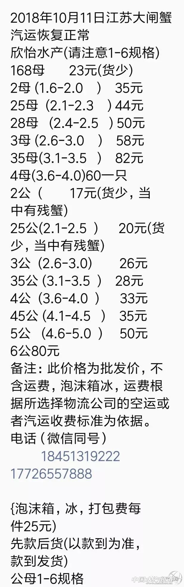 文/水產前沿實習編輯 沈君 本周蟹新聞摘要 1、套路深!一只大閘蟹不經手卻凈賺20萬!“蟹券”的出現讓螃蟹變成了可以隨時提取的“期貨”,業界稱為“紙螃蟹”。舉個例子,經銷商印刷面值500元的蟹券,以400元賣給企業采購人員,企業采購人員拿去送禮,收禮者以250元的價格賣給回收者,回收者再以300元的賣給經銷商。這樣操作下來,按照單張蟹券400元計算,一萬張就能沉淀400萬資金,即使手里一只螃蟹都沒有,倒賣2000張蟹券就能賺到20萬。 2、第十一屆世界華人蝦蟹養殖研討會將于2018年11月24-27日在汕頭大學舉行【詳情點擊:重磅!蝦蟹業精英云集,第十一屆世界華人蝦蟹養殖研討會邀您參加】。 本周走勢(部分產區) 江蘇興化 本周興化蟹價較為平穩,微跌后微漲,同規格價差一般在0-5元/斤,10月8日、9日兩天價格最低。如2.8兩母蟹由42元/斤跌至10月8日、9日最低的40元/斤,后又回到42元/斤。 湖北監利 本周監利蟹價經歷一段較大的起伏后進入平穩。如2兩母蟹,由45元/斤跌至36元/斤,又回到45元/斤,隨后又跌至38元/斤并一直保持到今天;4兩公蟹由35元/斤跌至33元/斤,后漲至36元/斤,第二天又跌回33元/斤,今天又回到35元/斤。 上海 本周上海母蟹蟹價較為平穩,公蟹微跌,價差在5元/斤左右。如1.8兩母蟹基本在33-35元/斤之間來回走動;2.5兩公蟹由23元/斤跌至18元/斤,昨天每斤漲了1元并保持到今天;3兩公蟹由26元/斤一路跌至22元/斤后橫平。 今日蟹價(部分產區) 江蘇興化 江蘇無錫 上海 湖北監利 安徽宣城 下周預測 國慶過后,本周蟹價較為平穩,部分規格微跌,市場逐漸進入平穩期。目前母蟹基本成熟,部分產區公蟹還未完全成熟,公蟹價格應有上升空間。預測下周母蟹蟹價保持平穩,公蟹微漲。(觀點僅供參考) |