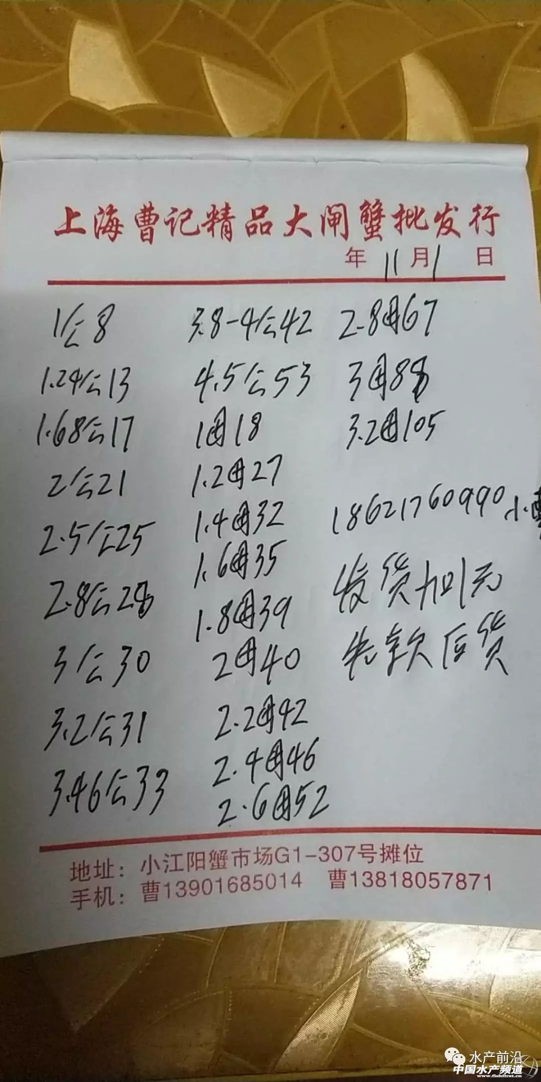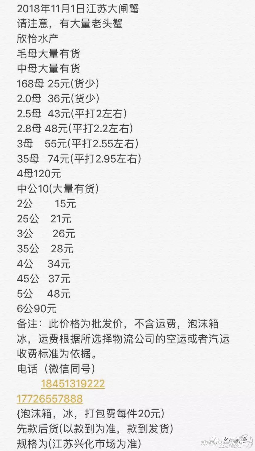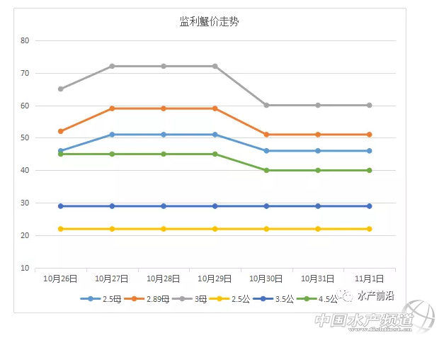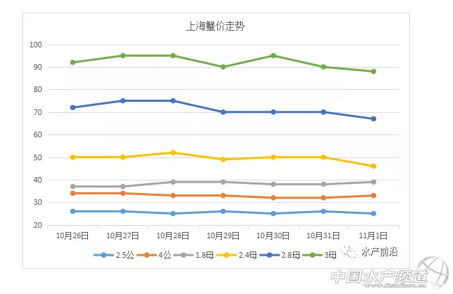 文/水產前沿實習編輯 沈君 本周蟹新聞 由上海海洋大學和常州市金壇區人民政府主辦的“第三屆中國河蟹產業發展高峰論壇暨2018海峽兩岸河蟹大賽”,將于11月15日在金壇舉辦。【11月江蘇常州,13位知名專家邀你來聊河蟹生態養殖與遺傳育種、營養飼料、品牌打造、電商流通的那些事】 近期,昆山市陽澄湖老漁民水產有限公司公布2018年種蟹收購價,最高達8000元/只,最低600元/只,經證實,收購情況屬實,目前天天在收。 本周走勢(部分產區) 江蘇興化 本周興化蟹價整體平穩,大規格蟹略有波動,小規格蟹基本橫平。如6兩公蟹在29日上漲5元/斤,至今保持在75元/斤;3.5兩母蟹微漲再微跌,由65元/斤上漲至66元/斤,后跌至62元/斤;3兩公蟹則待在20元/斤原地不動。 上海 本周上海蟹價呈波浪狀走勢,規格越大波動價差越大。如2.5兩公蟹是25、26元/斤兩個價格交替上演;2.8兩母蟹則是在67-75元/斤之間波動;3兩母蟹則在88-95元/斤間波動。 湖北監利 本周監利大規格蟹價前期起伏較大,后期恢復平穩,小規格蟹基本橫平。如3兩母蟹由65元/斤漲至72元/斤,10月30日跌至60元/斤,跌幅、價差均最大;同一天,4.5兩公蟹由45元/斤跌至40元/斤;小規格的3兩公蟹則以29元/斤的價格運行了一周。 今日蟹價(部分產區) 江蘇興化 江蘇無錫 上海 湖北監利 安徽宣城 下周預測 受日進出貨量的影響,各商戶報價必然存在小范圍的波動,蟹價大范圍波動一般受節日、天氣等影響較大。近期,蟹價一直保持平穩態勢,氣溫變化溫和,無重要節慶日,預測下周蟹價繼續保持平穩。(觀點僅供參考) |