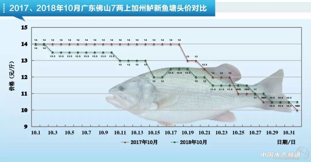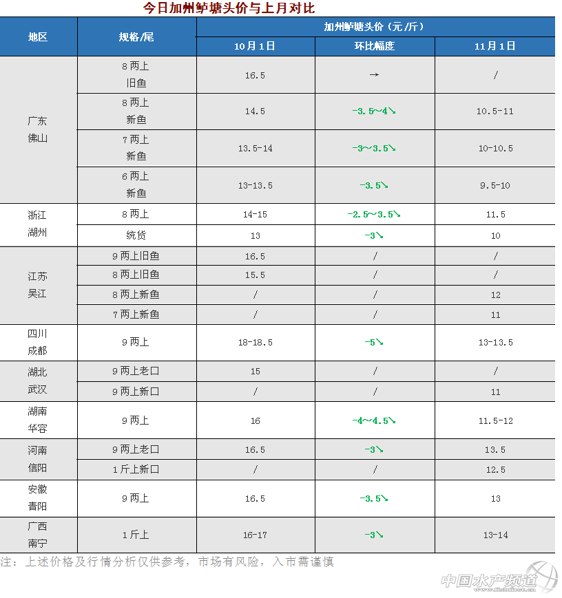 文/圖 水產(chǎn)前沿 李曉欣 10月,是大部分加州鱸產(chǎn)區(qū)舊魚和老魚交替的時(shí)段,多地舊魚已經(jīng)清空,新魚也接踵上市。隨著主產(chǎn)區(qū)新魚上市量的加大,全國魚價(jià)逐漸回落。 10月各產(chǎn)區(qū)行情簡析 廣東佛山:舊魚上旬清空,新魚大量上市沖擊魚價(jià) 10月,廣東佛山8兩上舊魚于上旬清空,魚價(jià)從月初的16.5元/斤跌至16元/斤,至此宣告著今年佛山8兩上老口鱸魚的最高價(jià)格為17.5元/斤,未能突破18元關(guān)口,比去年最高價(jià)格22元/斤低了4.5元/斤。 10月佛山新口鱸魚也陸續(xù)迎來上市高峰,受此影響,各規(guī)格新魚價(jià)格一路震蕩下跌。其中6兩上新魚從月初的13-13.5元/斤跌至今天的9.5-10元/斤;7兩上新魚從月初的13.5-14元/斤跌至今天的10-10.5元/斤;8兩上新魚從月初的14.5元/斤跌至今天的10.5-11元/斤;各規(guī)格跌了3-4元/斤不等。 從2017、2018年10月廣東佛山7兩上加州鱸新魚塘頭價(jià)對比走勢圖可知,去年10月中下旬開始魚價(jià)也是一路下滑,7兩上新魚從月初的13.5-14元/斤跌至月尾的10-10.5元/斤,跌幅達(dá)3.5元/斤,目前魚價(jià)與去年同期持平。 目前佛山地區(qū)大多養(yǎng)戶傾向出8兩上規(guī)格,以拉高賣價(jià)。部分養(yǎng)戶出了第一、第二網(wǎng)魚后現(xiàn)在選擇觀望,特別是部分已經(jīng)出了第二網(wǎng)魚的養(yǎng)殖戶,惜售心理明顯增強(qiáng)。預(yù)計(jì)接下來魚價(jià)持穩(wěn)或有小幅下滑,但降幅空間不大。 浙江湖州:新魚加大上市,魚價(jià)逐步下滑 10月以來浙江湖州當(dāng)?shù)乩峡邝|魚陸續(xù)清塘,目前已經(jīng)所剩不多,本地新魚陸續(xù)上市。隨著新魚上市增多,魚價(jià)逐步下滑,今天報(bào)價(jià)新口8兩上11.5/斤,相比10月初14-15元/斤跌了2.5-3.5元/斤;統(tǒng)貨報(bào)價(jià)10元/斤左右,比10月初13元/斤跌了3元/斤。目前湖州新魚上市量逐漸加大,預(yù)計(jì)后市魚價(jià)還將有所波動。 江蘇吳江:舊魚清空,新魚上市增多 10月中旬,吳江本地老口鱸魚已經(jīng)基本清空,8兩上舊魚價(jià)格從10月初的15元/斤跌至14元/斤,9兩上舊魚從10月初的16元/斤跌至15元/斤,跌幅均為1元/斤。吳江新魚也逐漸上市增多,主要以出8兩上為主,今天7兩上報(bào)價(jià)11元/斤,8兩上報(bào)價(jià)12元/斤,目前魚價(jià)基本上已經(jīng)達(dá)到臨界點(diǎn),部分養(yǎng)殖戶觀望心理增強(qiáng)。 四川成都:老口魚清空,養(yǎng)戶積極出新魚 10月上旬四川老口鱸魚已經(jīng)基本清完,新魚也緊接著陸續(xù)上市,魚價(jià)下跌幅度較大。近期,四川當(dāng)?shù)仞B(yǎng)殖戶有新魚達(dá)上市規(guī)格的都在積極出魚,今天9兩上報(bào)價(jià)13-13.5元/斤,相比10月初18-18.5元/斤下跌了5元/斤,預(yù)計(jì)后期價(jià)格還將小幅度波動。 湖北武漢:老魚基本清空,以出新魚為主 10月以來武漢當(dāng)?shù)仞B(yǎng)戶積極出魚清塘,到下旬老口鱸魚已經(jīng)基本清空,現(xiàn)在市場上以本地新魚和廣東新魚為主。受廣東魚影響,加上武漢本地新魚上市逐漸增多,武漢新口魚價(jià)從12元/斤左右跌至11元/斤,跌幅1元/斤,具體看魚頭大小和大魚比例而定。 湖南華容:少量老口存塘,市場走量減少 10月國慶期間華容當(dāng)?shù)仞B(yǎng)戶出魚積極,出魚量增加明顯。受廣東魚影響,華容魚價(jià)也逐步下降,今天報(bào)價(jià)11.5-12元/斤,相比10月初16元/斤下跌了4-4.5元/斤。當(dāng)前華容還有少量老口存塘,新魚也陸續(xù)上市,但近期市場銷量不大,整體出魚量有所減少。 安徽青陽:新魚未能上市,當(dāng)?shù)厍帱S不接 10月以來,青陽當(dāng)?shù)乩峡隰~達(dá)上市規(guī)格的都已陸續(xù)清塘,還有部分規(guī)格不夠的在并塘喂養(yǎng)。受吳江新魚上市增多影響,青陽魚價(jià)有所下跌,今天報(bào)價(jià)13元/斤,相比10月初16.5元/斤跌了3.5元/斤。青陽當(dāng)?shù)匦卖~距離上市還有1個(gè)月左右,現(xiàn)在整體處于青黃不接的狀態(tài)。 河南信陽:老口基本清完,新口少量上市 10月以來,受吳江魚影響,信陽魚價(jià)有所下滑,從10月初的16.5元/斤下跌至13.5元/斤,跌幅3元/斤。近期信陽出魚量很少,老口鱸魚已經(jīng)基本清完,大多新魚未達(dá)上市規(guī)格,有少量新口陸續(xù)上市,1斤上抓起12.5元/斤左右。 廣西南寧:受廣東魚影響,價(jià)跌3元/斤 受廣東新魚上市影響,流通商大多傾向到廣東拉魚,南寧本地魚價(jià)有所下跌。今天1斤上報(bào)價(jià)13-14元/斤,相比10月初16-17元/斤跌了3元/斤。目前廣西南寧本地老口鱸魚所剩不多,有少量新魚開始上市,但大部分還未達(dá)上市規(guī)格。 |