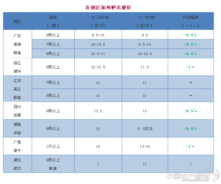 中國水產頻道原創報道, 文|圖 何氏水產 水產前沿 李靜 加州鱸 1、廣東鱸魚新魚本周再次全線下跌了0.5元/斤,6兩以上9.5元/斤,7兩以上9.5-10元/斤,8兩以上10-10.5元/斤,最終成交價還是看魚頭以及8兩以上的比例來定價的。現在廣東各大主產區的新魚存塘量還有挺多,很多養戶低過10元/斤都不愿意出魚,特別是出過第一網與第二網的養戶,惜售心理增強。現在存塘量的魚還是以1.3-1.4斤魚頭為主,1.5-1.6斤魚頭的還是不多。由于外省本地魚也在大量出新魚,價格也一路下滑,導致廣東銷量有所下降。預測接下來價格會持穩或繼續小幅下滑,銷量平穩。 2、浙江湖州現在新魚大量上市,本周價格比上周再跌了1元/斤左右,銷量不多。江蘇吳江本周價格與上周一樣,7兩以上11元/斤,8兩以上12元/斤,目前塘頭都是出8兩以上魚為主,銷量相對下滑了,預測接下來價格或許會持穩,養戶惜售。四川成都價格再一次下滑,9兩以上13元/斤,本地銷量大。廣西南寧、湖南華容新魚也在大量上市,價格都比上周繼續下跌了0.5-1元/斤。湖北武漢9兩以上新魚開塘價11元/斤。 |