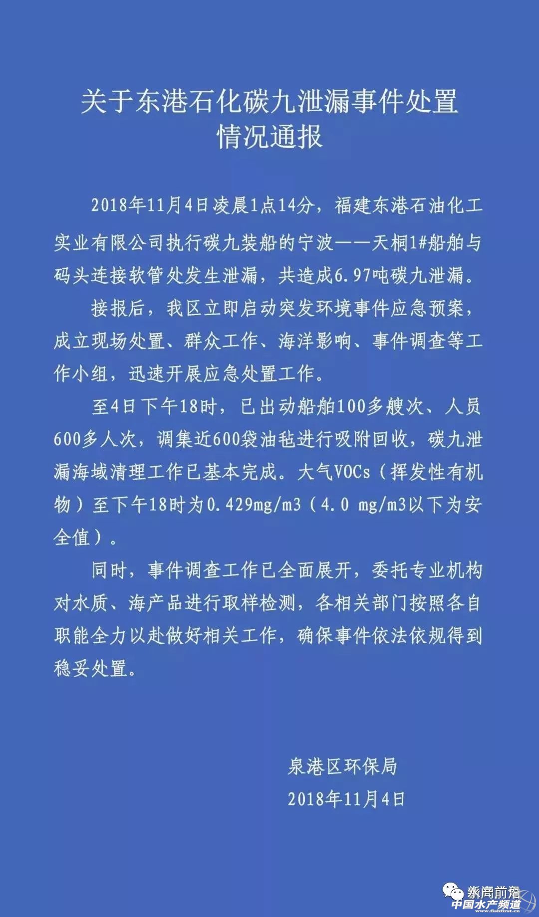 中國水產頻道報道,又一場養殖災難,損失或達數億?誰為養殖戶買單? 昨天早上 在廣角微信后臺許多人留言 福建泉州泉港的空氣彌漫刺鼻異味 并發來視頻 泉港區環保局發布了情況通報 泉港區環保局關于泉港城區區域 空氣彌漫異味的情況通報 2018年11月4日凌晨3點起,泉港區后龍鎮上西村及峰前村、峰尾鎮區域空氣出現異味,并隨著風向及風速飄移在主城區一帶擴散,引起群眾投訴反映。對此,我局值班人員立即趕赴上西村附近區域,根據當時主導風向,對周邊區域進行排查。經初步調查,2018年11月4日凌晨1時許,福建省東港石油化工實業有限公司進行油品裝卸作業,其油船連接至碼頭的軟管法蘭墊片老化、破損,導致部分油品泄漏,油氣逸散至空氣,致使相關區域空氣存在異味。該公司發現后已采取應急措施,立即通知港口管理局。同時,及時更換破損軟管,并采取吸油氈和圍油欄隔離等措施,對海面泄漏油品進行緊急處理。 由于泉港區目前氣壓較低,風力較小,其氣味難以消散,導致峰尾鎮、南埔鎮及后龍鎮區域彌漫油氣氣味。泉港區環保、海事、港口管理、農林水部門根據部門職責,開展處置工作。我局將繼續跟蹤該事態的發展。 泉港區環保局 2018年11月4日 昨天上午十點,記者來到泉港區南埔鎮肖厝村肖厝碼頭,海面上漂浮著厚厚一層看起來像油漬一樣的漂浮物,氣味相當刺鼻。據當地村民介紹,這些漂浮物是泄漏的石油,海水漲潮后被帶到這個地方。 隨后,記者跟隨當地漁民登上了海面上的多個漁排,發現用來固定漁排的泡沫箱出現塌陷。據了解,當地村民九千余人,共有五千多箱漁排。 泉港區南埔鎮肖厝村村民肖先生告訴記者:“半個排都沉下去了,魚都跑出去了,一個排最少都損失幾十萬了。” 記者了解到,泉港區農林水局發出通知,為保障廣大人民群眾食用水產品安全,即日起暫緩起捕,銷售和食用肖厝村海域水產品,沿海各鎮街道要做好養殖戶工作,并通過各種形式告知群眾提高自我防范意識,確保身體健康。 剛剛 泉港區環保局再次發布情況通報 轉載聲明 本文轉自【新聞廣角綜合泉港廣電、泉港區環保局】。如有版權問題,敬請聯系wx@fishfirst.cn。 |