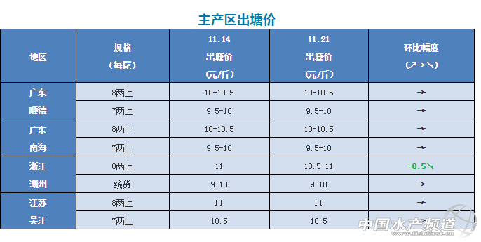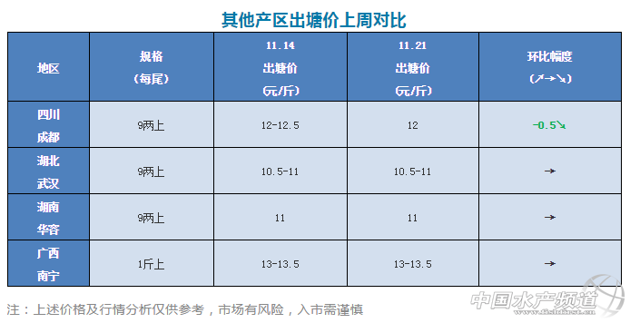 本周,產區加州鱸塘頭價大多以企穩為主,浙江湖州和四川成都魚價略有下滑。其中,浙江湖州8兩上加州鱸從上周的11元/斤下跌至10.5-11元/斤,跌幅0.5元/斤;四川成都魚價受廣東魚影響下跌了0.5/斤,今天報價12元/斤;其他產區魚價基本持穩。