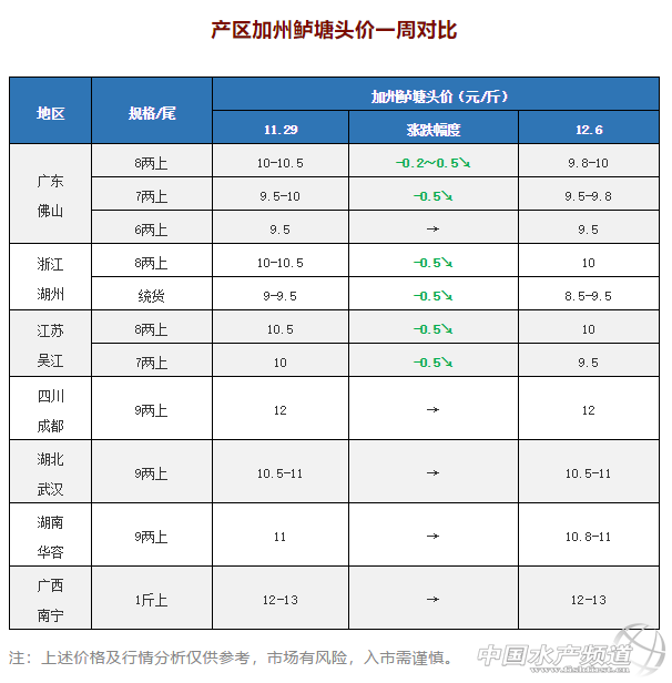 中國水產頻道原創報道, 養好魚,更要賣好魚! 加州鱸行情周報 《鱖鱸前沿》與您相約每周四 文/圖 水產前沿 李曉欣 本周,廣東加州鱸塘頭價在持穩了超20天后出現下滑,6兩上9.5元/斤,7兩上9.5-9.8元/斤,8兩上9.8-10元/斤。受廣東魚價影響,浙江、江蘇加州鱸塘頭價也下滑了0.5元/斤。其中,浙江湖州8兩上報價10元/斤左右,統貨報價8.5-9.5元/斤左右;江蘇吳江7兩上報價9.5元/斤,8兩上10元/斤,江浙標魚雙雙跌至10元關口。 目前的魚價,江蘇地區的養戶出魚意愿不大,想等到明年夏天再賣;而浙江地區的養戶擔心存塘風險大多在清塘出魚,江蘇地區的流通商多到浙江收魚。業內人士預計,短期內江浙兩地的魚價上漲較為乏力,建議養戶理性看待魚價,適時出魚以確保養殖收益。 廣東佛山 佛山加州鱸塘頭價在持穩了20多天后,本周有所下滑,今天報價6兩上9.5元/斤,7兩上9.5-9.8元/斤,8兩上9.8-10元/斤,其中8兩半9.8元/斤左右,1斤上10元/斤左右。目前魚價養戶出魚積極性不高,選擇出魚的養戶很少出6、7兩規格,大多出8兩上、1斤上來提高產量和效益。 浙江湖州 今天湖州加州鱸塘頭價下滑了0.5元/斤,8兩上報價10元/斤左右,統貨報價8.5-9.5元/斤左右,具體看8兩上成次。據當地魚中介紹,湖州當地統貨出塘價在8.5-9元/斤,成數達8成、無夾子、炮頭1.7斤的才有9.5元/斤,有魚中今天收8兩上7成、無夾子、炮頭1.5斤的出塘價為8.9元/斤。目前,湖州地區的養戶為了減輕存塘壓力而在積極清塘出魚,本地上市量大。 江蘇吳江 受廣東魚價影響,吳江加州鱸塘頭價有所下滑。今天7兩上報價9.5元/斤,8兩上10元/斤,各規格相比上周跌了0.5元/斤。現在的魚價未達養戶心理預期,吳江本地出魚量很少,當地流通商多到湖州收魚。 四川成都 成都加州鱸塘頭價一周持平,今天9兩上報價12元/斤。成都當地的養戶大多在觀望惜售,一方面是魚價未達養戶預期;另一方面,冬季四川本地鱸魚攝食量大大減少,養戶不擔心二網魚存在超標問題,同時水溫低養殖戶擔心出魚有損傷,增加感染水霉病的風險,所以整體出魚積極性不高。 湖北武漢 武漢加州鱸塘頭價持穩了超1個月,今天報價10.5-11元/斤左右。由于魚價未達預期,加上武漢本地達上市規格的存魚減少,當地養戶整體出魚積極性不高,流通商多到廣東收魚,市場以廣東魚為主。 湖南華容 今天華容9兩上加州鱸報價10.8-11元/斤左右,現在華容標魚相比之前有所減少,部分養戶開始觀望等價,本地走量不大,預計短期內魚價還是以維穩為主。 廣西南寧 本周南寧1斤上加州鱸塘頭價基本持穩在12-13元/斤,現在南寧本地存塘不足3成,且達上市規格的還比較少,養戶基本很少出魚,流通商多到廣東拉魚回本地市場。 產區加州鱸塘頭價一周對比 注:上述價格及行情分析僅供參考,市場有風險,入市需謹慎。 |