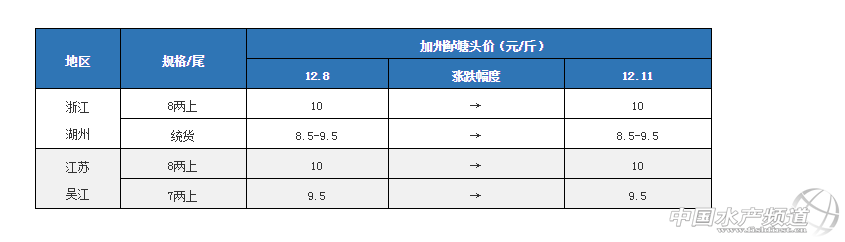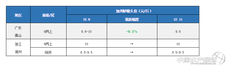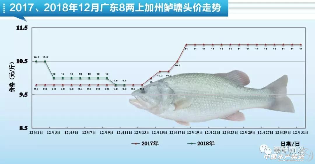 中國水產(chǎn)頻道原創(chuàng)報道,12月11日各產(chǎn)區(qū)加州鱸行情與塘頭報價 文/圖 水產(chǎn)前沿 李曉欣 今天廣東佛山8兩上加州鱸報價9.8元/斤左右,相比8日9.8-10元/斤下跌了0.2元/斤。魚價下滑主要江浙等省區(qū)魚價與廣東接近,導致外省魚車到廣東收魚減少,銷量上不去;另外,今年6月份放苗的養(yǎng)戶近期出頭箍魚,對魚價也有所沖擊。 據(jù)悉,去年同期佛山8兩上加州鱸塘頭價為9.7-9.8元/斤左右,目前魚價同比去年同期相差無幾。從上面走勢圖可知,去年12月中旬佛山8兩上加州鱸開始回暖,部分養(yǎng)戶對后市行情有所期盼,加上近期氣溫下降,出魚容易損傷導致患水霉病的風險增加,有些養(yǎng)戶選擇觀望惜售。 產(chǎn)區(qū)加州鱸塘頭價及行情簡析 華南地區(qū) 廣東佛山:佛山今天報價8兩上9.8元/斤左右,具體成交價看魚頭大小和規(guī)格比例略有浮動。魚價低于10元/斤時,順德、沙頭地區(qū)的養(yǎng)戶出魚意愿不高,加上近幾天氣溫下降,部分養(yǎng)戶觀望惜售。現(xiàn)在出魚的養(yǎng)戶以出大規(guī)格魚為主,預計短期內魚價企穩(wěn),元旦前后銷量或將有所上升。 廣西南寧:今天南寧1斤上加州鱸塘頭價依然維持在12-13元/斤,南寧本地基本很少出魚,市場以廣東魚為主。 華東地區(qū) 浙江湖州:今天湖州8兩上加州鱸報價10元/斤左右,統(tǒng)貨報價8.5-9.5元/斤左右,具體看8兩上成次。近期湖州降溫降雪,不過對出魚暫時沒有影響,本地出魚量仍較大,現(xiàn)在養(yǎng)戶以出統(tǒng)貨為主。湖州當?shù)赜袀別塘口出現(xiàn)水霉和爛身現(xiàn)象,建議養(yǎng)戶做好防范。 江蘇吳江:今天吳江加州鱸7兩上報價9.5元/斤,8兩上10元/斤。目前的魚價吳江養(yǎng)戶出魚意愿不強,當?shù)鼗竞苌俪鲷~,流通商多到湖州區(qū)域收魚,預計魚價短期內波動不大。 華中地區(qū)