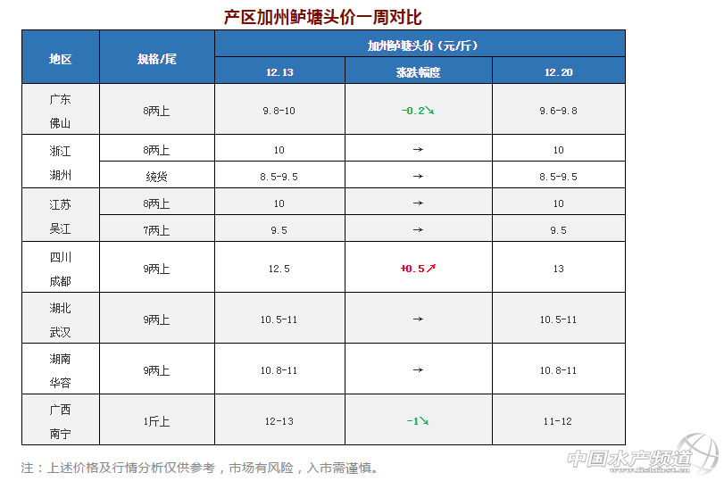 中國水產(chǎn)頻道原創(chuàng)報道, 養(yǎng)好魚,更要賣好魚! 加州鱸行情周報 《鱖鱸前沿》與您相約每周四 文/圖 水產(chǎn)前沿 李曉欣 本周產(chǎn)區(qū)加州鱸塘頭價漲跌互現(xiàn),其中,四川成都9兩上加州鱸漲勢強勁,自13日回漲0.5元/斤后,昨天再次上漲0.5元/斤,塘頭報價13元/斤。 相反的是,兩廣地區(qū)魚價遇冷,廣東佛山8兩上加州鱸今天報價9.6-9.8元/斤,相比上周價格9.8元/斤下跌了0.2/斤;廣西南寧1斤上加州鱸從13日12-13元/斤下跌至11-12元/斤,跌幅1元/斤;其他產(chǎn)區(qū)魚價基本保持不變。臨近元旦,預計各地鱸魚銷量將有所走俏,屆時魚價行情或有一定波動。 廣東佛山 今天廣東佛山8兩上報價9.6-9.8元/斤左右,比上周價格9.8元/斤下跌了0.2元/斤,實際成交價根據(jù)魚的規(guī)格大小比例略有浮動,現(xiàn)在出魚以大規(guī)格為主。臨近年底,部分養(yǎng)戶出魚以周轉(zhuǎn)資金繳納塘租及飼料等費用,有些不擔心存魚超標、資金較為寬裕的養(yǎng)戶惜售待價。 浙江湖州 湖州加州鱸塘頭價企穩(wěn)已有半個月,8兩上報價10元/斤左右,統(tǒng)貨報價8.5-9.5元/斤左右,養(yǎng)戶大多出統(tǒng)貨。本周氣溫有所回升,湖州地區(qū)出魚養(yǎng)戶比上周增多,目前當?shù)卮嫣亮亢统鲷~量仍較大,魚價上漲較為乏力。 江蘇吳江 吳江7兩上加州鱸今天報價9.5元/斤,8兩上10元/斤,目前魚價已持穩(wěn)了半個月,當?shù)仞B(yǎng)戶出魚意愿不強,多在觀望等價,部分養(yǎng)戶為周轉(zhuǎn)資金還飼料款而出魚,但總體出魚量不大。 四川成都 四川成都9兩上加州鱸漲勢強勁,自13日回漲0.5元/斤后,昨天再次上漲0.5元/斤,塘頭報價13元/斤。由于魚價未達預期,四川當?shù)仞B(yǎng)戶大多在觀望惜售,流通商為了滿足市場訂單而上調(diào)價格刺激養(yǎng)戶出魚。價格回升后養(yǎng)戶出魚積極性有所提升,受外地魚車影響,預計后市魚價將暫時持穩(wěn)。 湖北武漢 本周武漢加州鱸塘頭價企穩(wěn)了將近50天,9兩上報價10.5-11元/斤左右,現(xiàn)在武漢本地出魚量較小,市場以廣東魚為主,預計短期內(nèi)魚價上漲機會不大。 湖南華容 本周華容9兩上加州鱸維持在10.8-11元/斤左右,目前魚價持穩(wěn)已久,近期華容本地魚走量都不大,臨近元旦,部分養(yǎng)戶開始觀望等價。 廣西南寧 本周南寧1斤上加州鱸塘頭價下滑了1元/斤,今天報價11-12元/斤,主要是受廣東魚沖擊市場影響。近期南寧有部分養(yǎng)戶清塘后開始購苗回來投放新苗。目前南寧本地存塘魚不多,養(yǎng)戶惜售心理有所增強。 |
