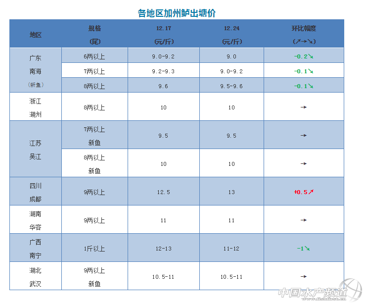 中國水產頻道原創報道, 文|圖 何氏水產 水產前沿 李靜 上周全國加州鱸塘頭價漲跌不一,廣東鱸魚微跌了0.1-0.2元/斤,廣西鱸魚跌了1元/斤;四川成都再漲了0.5元/斤,其他地區與上周保持一致。