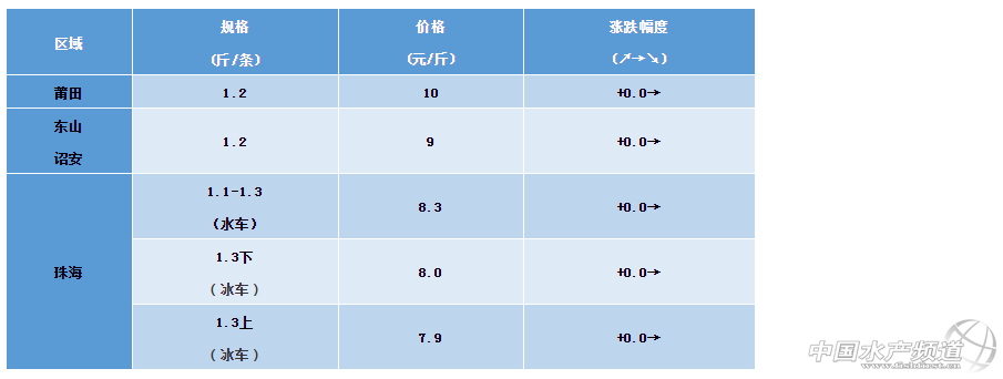 文/ 水產(chǎn)前沿 植銀素 中國水產(chǎn)頻道原創(chuàng)報道,福建莆田、東山、詔安區(qū)域:鱸魚均已達到上市規(guī)格,存塘規(guī)格在1.5-2.2斤。福建地區(qū)鱸魚銷售主要活魚為主,隨著溫度下降,鱸魚市場需求有所增加,本周價格相對穩(wěn)定。 廣東珠海區(qū)域:價格基本無變化,水車8.3元,1.3斤下冰車8.0元,1.3斤上冰車7.9元。1)魚價開始下滑,元旦魚基本打完,市場需求量暫時下滑;2)舊魚需求量依舊銷售困難;3)鱸魚苗成活率低,整體反饋黑身死魚依舊比較厲害。 ※上述報價可能會因區(qū)域、規(guī)格、品質(zhì)和時間等因素的不同而會產(chǎn)生差異,在此僅供參考。環(huán)比幅度以本周價格與上周價格數(shù)據(jù)做對比 【關(guān)鍵字】:海鱸 海鱸價格 水產(chǎn)養(yǎng)殖 |