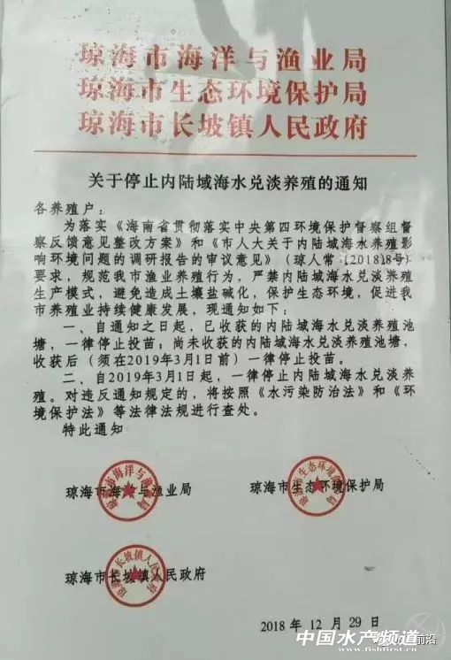 中國水產頻道獨家報道, 這一類養殖模式要注意了,一不留神,禁的下一個可能就是你! 文/ 水產前沿 李釩 近日,海南省瓊海市出臺的關于“全面禁止內陸域海水兌淡養殖生產模式,2019年3月1日前,瓊海地區要全面停止該生產活動”的一紙文件,使當地的養殖戶又陷入了迷茫。 2018年12月29日,海南瓊海市海洋與漁業局、生態環境保護局、長坡鎮人民政府聯合發布《關于停止內陸域海水兌淡養殖的通知》,全文如下: 各養殖戶,為落實《海南省貫徹中央第四環境保護督察組督察反饋意見整改方案》和《市人大關于內陸域海水養殖影響環境問題的調研報告的審議意見》(瓊人常(2018)8號)要求,規范我市漁業養殖行為,嚴禁內陸域海水兌淡養殖生產模式,避免造成土壤鹽堿化,保護生態環境,促進我市養殖業持續健康發展,現通知如下: 一、自通知之日起,已收獲的內陸域海水兌淡養殖池塘,一律停止投苗;尚未收獲的內陸域海水兌淡養殖池塘,收獲后(須在2019年3月1日前)一律停止投苗。 二、自2019年3月1日起,一律停止內陸域海水兌淡養殖。對違反通知規定的,將按照《水污染防治法》和《環境保護法》等法律法規進行查處。 由于近年來對蝦養殖病害肆虐,養殖環境惡化,養殖戶為了生存發展而催生了一個新的養殖模式——內陸區域海水兌淡養殖南美白對蝦。通過汽車運輸高鹽度海水到內陸池塘逐步淡化的模式,對蝦養殖獲得較好的養殖效果,養殖面積也不斷擴大。 在海南整個瓊海地區對蝦養殖由沿海地區退回到內陸地區沿河沿水庫周邊養殖,主要集中在瓊海市長坡鎮周邊內陸,整個長坡海水兌淡養殖面積高達數千畝。 據瓊海采用這一模式的一名養殖大戶介紹,在通知發布前,就已經有領導找他們約談,“他們先動員大規模的養殖戶,小規模的養殖戶會跟著慢慢退出。”該養殖大戶說到。 紅圈為海水兌淡養殖區域 對于禁止內陸域海水兌淡養殖,海南其實并不是先例。去年,由于江蘇如東小棚養殖令人咋舌的擴張速度帶來了諸如土壤鹽堿化、淺表地下水大量資源浪費的一系列生態環境破壞問題,當局出臺了新的政策:部分地區嚴禁非法取水,取用地下水從事水產養殖須經水行政主管部門批準。禁止使用鹵水和含鹽量超2‰的地下水從事水產養殖,嚴禁養殖過程中添加海水晶、鹽等鹽類物質。 內陸養殖南美白對蝦,這里就涉及到土地鹽堿化的問題。 土壤鹽堿化又稱土壤鹽漬化,指土壤中可溶性鹽類隨水向表層移動并積累下來,而使可溶性鹽含量超過0.3%的過程。土壤含鹽量太高,從而使農作物低產或不能生長。簡單說,就是土壤里邊含有太多鹽分。 據調查了解,湖南和湖北地區的南美白對蝦養殖面積超過6萬畝,其中湖北地區約2.5萬畝,主要在武漢、仙桃、荊州等地;湖南地區約3.5萬畝,集中在常德、澧縣一帶,該地區超過1.5萬畝的養殖。兩湖地區南美白對蝦養殖主要通過海水兌淡養殖,每次放蝦苗需要使用海水晶或者海鹽調整池塘水質鹽度,以適合投放蝦苗,多的時候需要1噸鹽/畝池塘,還要補充鈣、鎂、磷等必需礦物元素和微量元素,就是模擬生態的海水,人為的加入工業鹽和各種微量元素,破壞了水體的生物鏈,如果不加以規劃和調控,很多人一窩蜂的進行養殖,長期下去就會造成蝦池鹽堿化和底質板結,最終導致無法持續養殖。 另外,浙江內陸地區的羅氏沼蝦育苗也需要使用到人工海水,這類生產方式也需要時刻注意政策性的風險。 瓊海政府此次發布正式文件,停止兌淡養殖,也是出于保護環境的考慮。政府發出禁養通知,在下達文件前相關部門已經約談了當地養殖戶,總體要求在2019年3月1日前全面停止生產活動,也給了養殖戶一個緩沖期。事件如何發展,水產前沿將繼續關注。 聚焦 | 回顧 |
