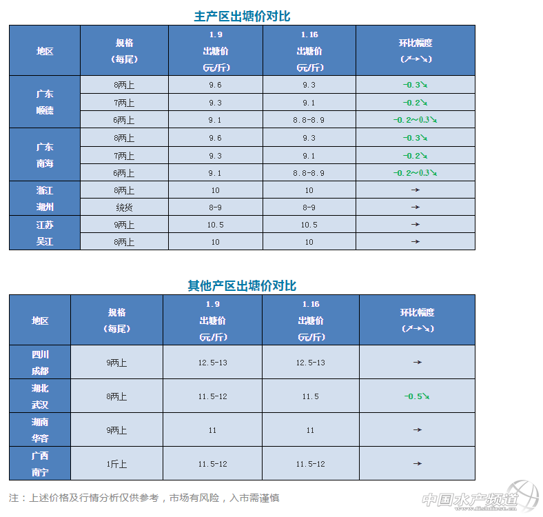 中國(guó)水產(chǎn)頻道原創(chuàng)報(bào)道,各產(chǎn)區(qū)加州鱸塘頭價(jià)與行情一周解析 文/圖 杰大飼料 水產(chǎn)前沿 李曉欣 聯(lián)合發(fā)布 本周,產(chǎn)區(qū)加州鱸塘頭價(jià)穩(wěn)中有降。廣東佛山各規(guī)格魚價(jià)相比上周跌了0.2-0.3元/斤不等,今天8兩上報(bào)價(jià)9.3元/斤;湖北武漢9兩上加州鱸今天報(bào)價(jià)11.5元/斤,相比上周11.5-12元/斤下跌了0.5元/斤;其他產(chǎn)區(qū)價(jià)格基本持穩(wěn)。 縱觀產(chǎn)區(qū)塘頭價(jià),四川成都9兩上加州鱸12.5-13元/斤,魚價(jià)領(lǐng)跑全國(guó)。而廣東魚價(jià)較為低迷,與部分外省地區(qū)魚價(jià)差距有所拉大,吸引外地流通商到廣東拉魚略有增多。近期低溫天氣,建議仍有存魚的養(yǎng)戶做好池塘管理和預(yù)防水霉病等工作,同時(shí)根據(jù)自身情況合理安排出魚時(shí)機(jī),確保養(yǎng)殖收益。 今日各地加州鱸塘頭價(jià)及本周行情分析 廣東順德:今天報(bào)價(jià)6兩上8.8-8.9元/斤,7兩上9.1元/斤左右,8兩上9.3元/斤,各規(guī)格魚價(jià)相比上周下跌了0.2-0.3元/斤不等,出魚以8兩上規(guī)格為主。由于價(jià)格偏低未達(dá)預(yù)期,近期養(yǎng)殖戶出魚積極性較低,杏壇、龍江等地區(qū)有部分養(yǎng)殖戶清塘,以空出魚塘為放苗、育苗作準(zhǔn)備。 廣東南海:今天報(bào)價(jià)6兩上8.8-8.9元/斤,7兩上9.1元/斤左右,8兩上9.3元/斤,市場(chǎng)上仍以8兩上規(guī)格為主,部分養(yǎng)戶擔(dān)心魚超大而排期出魚,但大多養(yǎng)戶惜售心理較強(qiáng)。臨近春節(jié)假期,預(yù)計(jì)需求量將會(huì)大幅增加,部分養(yǎng)殖戶期盼行情好市。 浙江湖州:今天報(bào)價(jià)8兩上10元/斤,統(tǒng)貨8-9元/斤,目前湖州存塘量還是比較大,加上快要過(guò)年,大部分養(yǎng)殖戶還是急需出魚,以騰空魚塘用于春節(jié)后標(biāo)苗。 江蘇吳江:吳江鱸魚8兩上報(bào)價(jià)10元/斤,9兩上10.5元/斤,按照目前這個(gè)價(jià)格,吳江出標(biāo)魚的養(yǎng)戶還是比較少,由于附近浙江湖州地區(qū)出魚較多,吳江地區(qū)近期魚價(jià)應(yīng)該較為平穩(wěn)。 四川成都:成都9兩上加州鱸今天報(bào)價(jià)12.5元/斤,1.1斤上13元/斤。本周成都天氣略有回暖,出魚養(yǎng)殖戶相比之前有所增加。 湖北武漢:武漢9兩上加州鱸報(bào)價(jià)11.5元/斤左右,相比上周11.5-12元/斤下跌了0.5元/斤,目前11.5元/斤的價(jià)格只有個(gè)別大戶愿意出,大多養(yǎng)戶出魚意愿不高。據(jù)悉,白沙洲市場(chǎng)7-9兩規(guī)格有流通商開(kāi)價(jià)10.8-11元/斤在拖,但這個(gè)價(jià)格出魚的養(yǎng)戶多是為周轉(zhuǎn)資金,手頭寬裕的養(yǎng)戶并不著急出魚,市場(chǎng)以廣東魚為主。 湖南華容:華容9兩上加州鱸報(bào)價(jià)11元/斤,與上周持平。目前魚價(jià)養(yǎng)戶出魚積極性不高,由于廣東魚價(jià)便宜,流通商多到廣東拉魚,華容當(dāng)?shù)刈吡亢苌佟?/div> 廣西南寧:今天報(bào)價(jià)1斤以上新魚價(jià)格11.5-12元/斤,當(dāng)?shù)卮嫣亮坎欢啵軓V東魚價(jià)影響,價(jià)錢與上周持平。 |