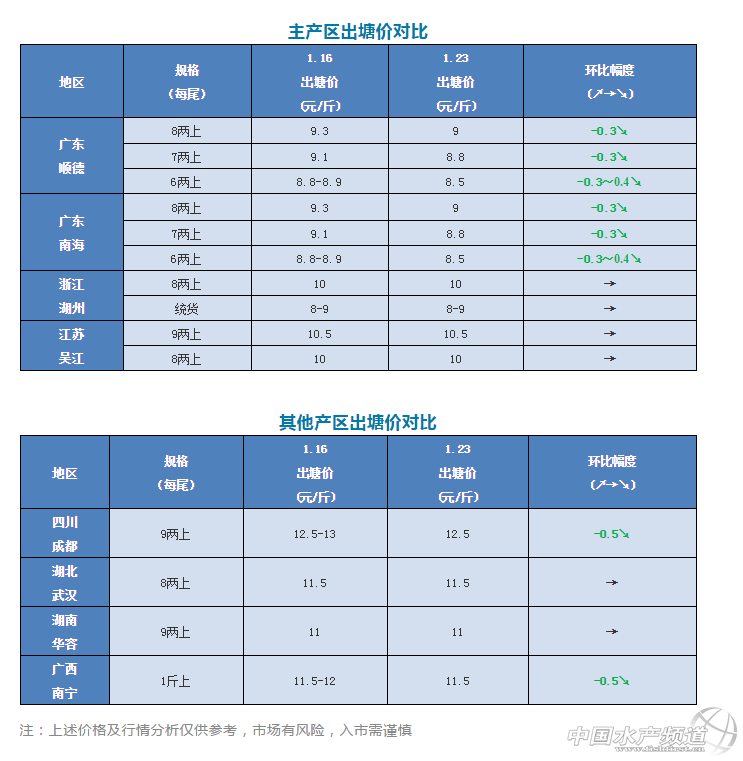 中國(guó)水產(chǎn)頻道原創(chuàng)報(bào)道,各產(chǎn)區(qū)加州鱸塘頭價(jià)與行情一周解析 文/圖 杰大飼料 水產(chǎn)前沿 李曉欣 聯(lián)合發(fā)布 本周,廣東佛山加州鱸塘頭價(jià)格再次下滑,今天6兩上報(bào)價(jià)8.5元/斤,7兩上8.8元/斤,8兩上9.0元/斤左右,各規(guī)格相比上周下跌了0.3-0.4元/斤不等,實(shí)際成交價(jià)看魚頭大小略有浮動(dòng)。受廣東魚價(jià)下跌影響,四川成都、廣西南寧加州鱸塘頭價(jià)也分別下滑了0.5元/斤,其他產(chǎn)區(qū)價(jià)格變動(dòng)不大。 現(xiàn)在距離春節(jié)僅剩10來(lái)天,預(yù)計(jì)在節(jié)日消費(fèi)的帶動(dòng)下,市場(chǎng)銷量將有所上升。業(yè)內(nèi)人士建議,魚價(jià)始終以市場(chǎng)供求為調(diào)節(jié)杠桿,養(yǎng)戶應(yīng)理性看待魚價(jià)走勢(shì),根據(jù)自身情況合理安排出魚時(shí)機(jī),確保養(yǎng)殖收益。 今日各地加州鱸塘頭價(jià)及本周行情分析 廣東順德:今天報(bào)價(jià)6兩上8.5元/斤,7兩上8.8元/斤,8兩上9.0元/斤左右,塘頭價(jià)看魚頭大小略有浮動(dòng)。魚價(jià)持續(xù)低迷,有一部分養(yǎng)殖戶不再等待而選擇出魚,近來(lái)清塘的養(yǎng)殖戶比之前略有增加,導(dǎo)致價(jià)格有所波動(dòng),但是依然有部分養(yǎng)殖戶寧愿繼續(xù)等待。臨近春節(jié),近期加州鱸銷量有所上升,今天有個(gè)別塘口臨時(shí)開下午魚。隨著年關(guān)越來(lái)越近,預(yù)計(jì)市場(chǎng)收魚需求還會(huì)增加,對(duì)魚價(jià)有一定的利好。 廣東南海:今天報(bào)價(jià)6兩上8.5元/斤,7兩上8.8元/斤,8兩上9.0元/斤左右,實(shí)際成交價(jià)視魚頭大小而定,目前魚價(jià)低于養(yǎng)殖戶預(yù)期,九江區(qū)域有部分養(yǎng)殖戶因?yàn)榍捌诔鲷~比較少,所以選擇近期趕在春節(jié)前出魚;而沙頭區(qū)域是傳統(tǒng)的養(yǎng)舊魚模式,最近兩周養(yǎng)戶出魚積極性很低,對(duì)投喂料也有所控制。 浙江湖州:今天報(bào)價(jià)8兩上10元/斤,統(tǒng)貨是8-9元/斤,價(jià)格與上周持平。目前湖州存塘量還是比較大,加上快要過(guò)年,大部分養(yǎng)殖戶還是急需出魚,騰空魚塘等來(lái)年標(biāo)苗,所以近期魚價(jià)穩(wěn)定。 江蘇吳江:吳江鱸魚8兩上報(bào)價(jià)10元/斤,9兩上報(bào)價(jià)10.5元/斤,按照目前這個(gè)價(jià)格,吳江地區(qū)選擇出標(biāo)魚的養(yǎng)殖戶還是比較少,附近湖州地區(qū)出魚量大,預(yù)計(jì)吳江地區(qū)近期魚價(jià)較為平穩(wěn)。 四川成都:今天成都9兩上加州鱸報(bào)價(jià)12.5元/斤,價(jià)格相比上周下跌了0.5元/斤。當(dāng)?shù)夭糠逐B(yǎng)殖戶想趕在魚產(chǎn)卵前出售,本周養(yǎng)戶出魚積極性有所提高,加上受廣東魚價(jià)下跌影響,成都鱸魚價(jià)格也有所波動(dòng)。 湖北武漢:武漢9兩上加州鱸報(bào)價(jià)11.5元/斤左右,廣東魚在武漢市場(chǎng)的批發(fā)價(jià)較低,對(duì)當(dāng)?shù)伧|魚價(jià)格有一定沖擊。本地魚的市場(chǎng)批發(fā)價(jià)較廣東魚高,當(dāng)?shù)亓魍ㄉ淘谔量?兩上抓起11.5元/斤左右,但本地養(yǎng)戶出魚積極性不高。 湖南華容:華容9兩上加州鱸報(bào)價(jià)11元/斤,與上周持平。目前魚價(jià)養(yǎng)戶出魚積極性不高,想等夏天價(jià)格較好時(shí)再出魚,本地出魚量少。 廣西南寧:今天報(bào)價(jià)9兩上11元/斤,1斤以上11.5元/斤,受廣東魚價(jià)影響,本周南寧價(jià)格下滑了0.5元/斤。隨著春節(jié)臨近,節(jié)日消費(fèi)增加對(duì)魚價(jià)或?qū)⒂兴瓌?dòng)。 |