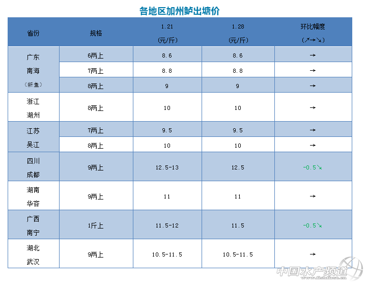 中國水產(chǎn)頻道原創(chuàng)報道, 文|圖 何氏水產(chǎn) 水產(chǎn)前沿 李靜 本周全國加州鱸魚價格基本穩(wěn)定,除了四川成都與廣西南寧本周比上周跌了0.5元/斤,其他產(chǎn)區(qū)與上周一樣。 1、廣東鱸魚本周價格與上周差不多,6兩以上8.6元/斤,7兩以上8.8元/斤,8兩以上9.0元/斤,最終成交價還是看魚頭、質(zhì)量以及8兩以上的比例來定價的。現(xiàn)在廣東產(chǎn)區(qū)鱸魚存塘量還有很多,接近年底,大部分出魚的養(yǎng)戶都是清塘出魚,出魚意愿高漲,收購商現(xiàn)在都是出春節(jié)的貨量,銷量上升。也有部分外省水車到廣東裝水車或者加工回本地銷售,廣東本地銷量增長。預(yù)計本周價格基本穩(wěn)定,銷量會節(jié)節(jié)上升。 2、浙江湖州新魚都是出統(tǒng)貨為主,8兩以上成交價還是10元/斤,統(tǒng)貨價格8-9元/斤,吸引部分附近收購商到本地拉水車,銷量上升,接下來價格暫時會持穩(wěn)。本周江蘇吳江價格還是不變,7兩以上9.5元/斤,8兩以上10元/斤,出魚量比上周大,預(yù)測接下來價格還會持穩(wěn),銷量越來越多。四川成都與廣西南寧產(chǎn)區(qū)由于廣東魚價便宜,對本地魚價會有沖擊,導(dǎo)致當(dāng)?shù)貎r格雙雙下跌了0.5元/斤,其他產(chǎn)區(qū)本周價格與上周一樣,銷量都比上周有所上漲,還會越來越大。 |