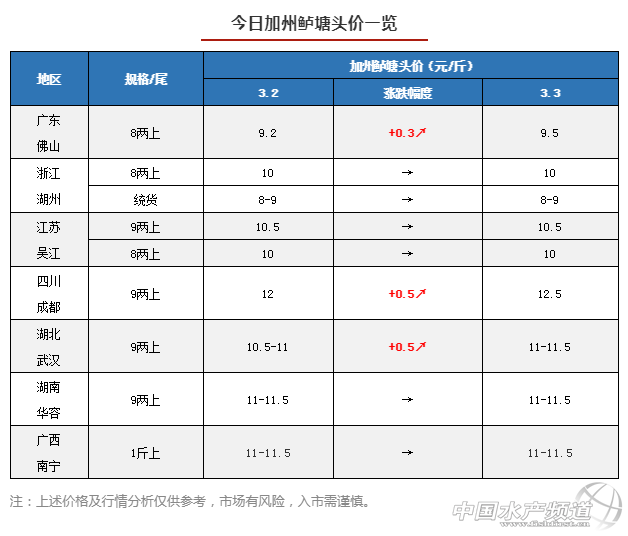 | 中國水產頻道原創報道, 文/圖 水產前沿 李曉欣 今天廣東佛山8兩上加州鱸塘頭報價9.5元/斤左右,相比昨天價格9.2元/斤上漲了0.3元/斤,1斤上報價9.7元/斤左右,實際成交價看魚頭大小和規格比例略有浮動。 2月28日至今,短短四天內,廣東魚價已經3次上調,漲幅達0.7元/斤,主要是受近幾天市場上大規格魚緊缺影響,行情回暖。 除了廣東,今天四川成都、湖北武漢加州鱸均上漲了0.5元/斤。其中,成都9兩上加州鱸今天報價12.5元/斤左右,有個別塘口開13元/斤,當地存塘魚達上市規格的減少,部分流通商收不夠魚,魚價有所上調; 武漢9兩上今天報價11-11.5元/斤,當地鱸魚行情在2月下旬遇冷,塘頭價走低,這兩天受廣東魚價上漲影響,行情也開始回暖;其他產區魚價變動不大。 總體上看,目前多地加州鱸行情呈現出回暖態勢。近幾天廣東魚價波動較大,很多養戶存在“賣跌不賣漲”的心理,觀望惜售;還有部分養戶擔心后市行情或又回落,決定先出一部分魚來分散風險。 業內人士建議,魚價始終以市場供求為調節杠桿,養戶應理性看待魚價走勢,根據自身情況合理安排出魚時機,最大限度地確保養殖收益。 |