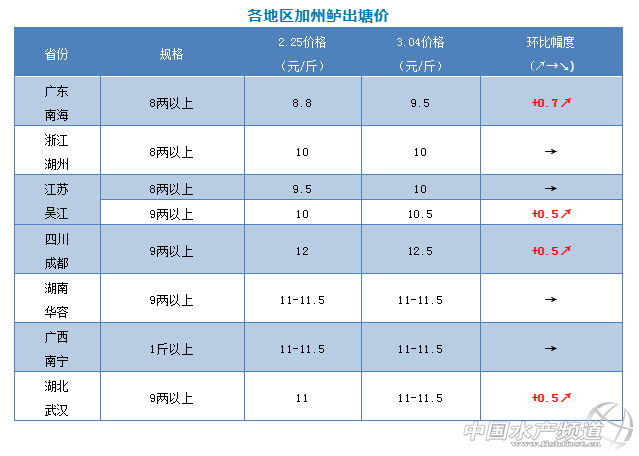 全國加州鱸行情全線回曖,廣東產區的價格本周經過約4次持續上漲,漲幅達到0.7元/斤,江蘇吳江、四川成都、湖北武漢三大產區的價格也比上周上漲了0.5元/斤,全國市場行情一般,銷量穩定。
