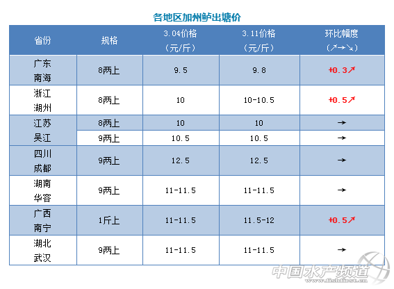 | 中國水產頻道原創報道, 文/圖 何氏水產、水產前沿 李靜 加州鱸 全國加州鱸本周行情持續上升,廣東產區8兩以上價格最高漲到10元/斤,這兩天回落了0.2元/斤,現成交價是9.8元/斤。浙江湖州、廣西南寧兩大產區的價格也比上周上漲了0.5元/斤,其他產區價格與上周一樣,全國市場行情與上周差不多,銷量穩定。 1、廣東鱸魚本周開塘價繼續上漲了0.3元/斤,8兩以上9.8元/斤,1斤以上10元/斤,塘頭成交價基本穩定下來,現在大部分魚塘都是清塘出魚,出統貨為主,最終成交價還是看8兩以上比例和質量來定價的。這兩天魚價穩定下來,除沙頭產區外,其他產區賣魚的養戶又多起來,貨源充足。由于廣東鱸魚價格全國最低,所以不少其他地區的水車過來廣東拉魚回本地銷售。預測本周持穩為主,銷量平穩。 2、浙江湖州鱸魚價格在持穩兩個月后上周終于上揚,8兩以上成交價從上周起漲了0.5元/斤,達到10.5元/斤,統貨價格8.5-10元/斤,上周銷量比較穩定。江蘇吳江價格上漲了0.5元/斤后,本周保持穩定,8兩以上還是10元/斤,9兩以上還是10.5元/斤,價格上漲了0.5元/斤,出魚量穩定,部分養戶還要觀望。受到廣東持續漲價的影響,廣西南寧本周價格也上漲了0.5元/斤。其他產區的價格與上周基本一樣,銷量穩定。 |
