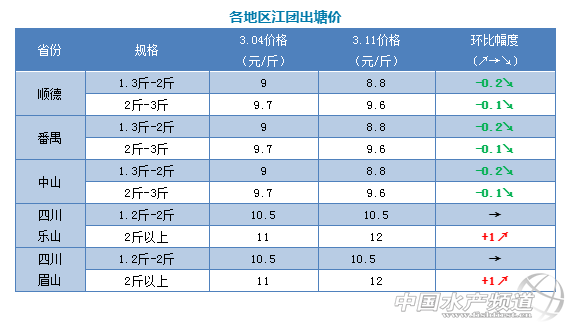 | 中國水產(chǎn)頻道原創(chuàng)報道, 文/圖 何氏水產(chǎn)、水產(chǎn)前沿 李靜 江團 1、本周廣東江團與上周相比大小魚價格都有小幅下跌,小魚下跌了0.2元/斤,成交價格8.8元/斤;大魚下跌了0.1元/斤,價格9.6元/斤。超大魚價格也下跌了0.2元/斤,只要6.3元/斤,現(xiàn)在廣東江團存塘量還能滿足市場需求,價格暫時上漲乏力,銷量變化不大。 2、本周四川江團大魚由于現(xiàn)在存塘量越來越少,銷量上漲,導(dǎo)致當?shù)卮篝~價格上漲了1元/斤,小魚存塘量能滿足市場需求,小魚價格還是10.5元/斤,銷量與上周差不多,預(yù)測大魚接下來價格還會有小幅的上漲空間,小魚價格保持不變,銷量變化也不多。 |