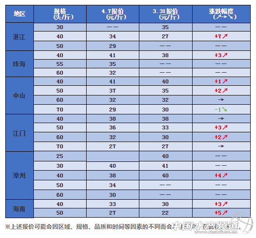 | 中國水產頻道原創報道, 4月7日南美白對蝦部分產地塘頭報價 文/圖 水產前沿 植銀素 本周行情 本周三(4月3日)珠三角地區價格出現短暫下滑,但是清明期間蝦價迅速呈現上漲態勢。中山、江門地區收購商都表示價格不負眾望,比周三上漲3-4元,對比上周同期上漲2-3元。 目前國內進入“蝦荒”時期,塘口多以小蝦為主,大蝦供應明顯不足,北方訂單逐漸減少因此珠三角地區價格也上漲乏力。近期華南地區逐漸升溫,粵西、珠三角地區有養殖戶早造小規格對蝦已少量上市,預計外塘投苗也將漸入高峰,但南方多地仍伴有雨水,養殖戶需謹慎預防病害發生。 珠海 中山 江門 今日江門地區蝦價40條38元/斤,50條36元/斤,60條32元/斤,70條27元/斤。清明期間行情高漲,蝦價反跌為漲,漲幅對比上周同期達到2-3元/斤,貨源明顯不足,塘口出售都以小蝦為主。 漳州 漳州地區蝦價30條40元/斤,40條38元/斤,50條34元/斤,60條30元/斤。大蝦緊缺,價格處于高位,但是養殖戶無蝦可賣,交易量極少,預計清明過后價格會稍有回落再保持穩定。 湛江 本周湛江徐聞高位池蝦價38條35元/斤,40條34元/斤,50條29元/斤。清明期間周邊市場對活蝦需求加大,價格呈現上漲狀態,雖然對比上周同期價格有所上漲,但供需已經達到平衡,本周整體價格在周三之后基本保持穩定。業內人士指出,節后價格回落的可能性較大。 據厄瓜多爾水產養殖協會(CNA)公布的數據顯示,2019年1、2月份,厄共出口56956噸到中國和越南,如果說所有出口越南的白蝦最終都流向中國,那么今年同期的進口量比去年增加了60%,相當于多出21374噸。出口數量上升,意味著價格下跌,因此1、2月厄瓜多爾白蝦價格同比下降了10%,也是2013年后單價新低。 大量進口蝦涌入中國市場,已經是一個非常大的打擊。加之近期太平洋大部分地區的赤道海面溫度高于平均值,預示著東太平洋將再次出現厄爾尼諾現象,業內人士普遍預測今年全球對蝦的供給仍會超過需求,這對蝦價上漲是個極大的阻礙,今年對蝦養殖收益不容樂觀。 |