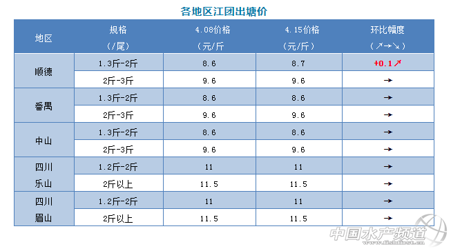 | 中國(guó)水產(chǎn)頻道原創(chuàng)報(bào)道, 文/圖 何氏水產(chǎn)、水產(chǎn)前沿 李靜 江團(tuán) 1、廣東江團(tuán)本周價(jià)格與上周對(duì)比:小魚成交價(jià)還是8.7元/斤,有0.1元/斤的微調(diào);大魚價(jià)格還是9.6元/斤,與上周一樣;超大魚價(jià)格還是在6.2元/斤。貨源充足,價(jià)格會(huì)慢慢拉升,銷量穩(wěn)定。 2、本周四川江團(tuán)小魚的價(jià)格還與上周保持一樣,小魚價(jià)格11元/斤,大魚價(jià)格11.5元/斤,銷量與上周差不多。預(yù)測(cè)接下來(lái)價(jià)格暫時(shí)持穩(wěn),銷量變化不大。 |