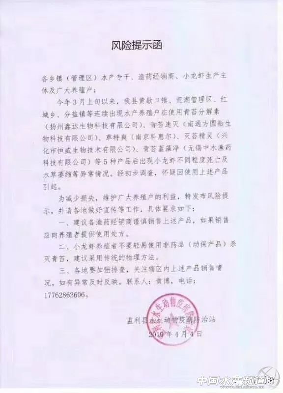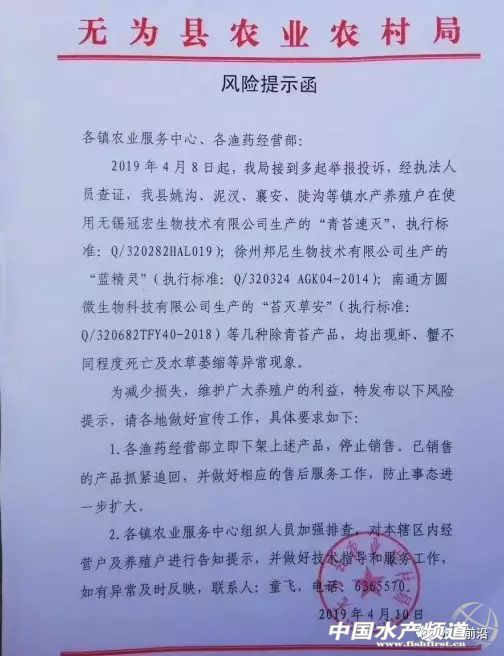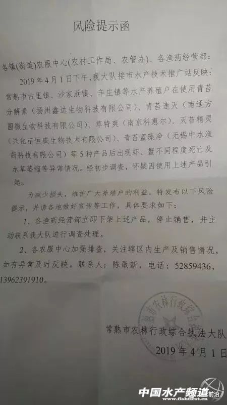 | 中國水產(chǎn)頻道原創(chuàng)報(bào)道, 愈演愈烈的滅青苔產(chǎn)品事故,誰將為多起悲劇埋單?他們做出最負(fù)責(zé)的回答! 文/ 水產(chǎn)前沿實(shí)習(xí)編輯 李帥 近日,水產(chǎn)業(yè)界人士被下面這則視頻刷屏了! 據(jù)視頻內(nèi)容顯示,這是一位在南京市高淳區(qū)蝦蟹養(yǎng)殖戶,其表示,因用了某廠家殺青苔的藥品,導(dǎo)致坂田上面寸草不生,60多斤的扁擔(dān)草籽撒到塘里沒有了,節(jié)節(jié)草也死光了,螃蟹受藥水刺激天天往岸邊爬,青蝦也死了不少,今年肯定是顆粒無收了,誰能為她討個(gè)說法? 此外,與視頻一起受到關(guān)注和熱議的,還有江蘇常熟、盱眙,湖北監(jiān)利、洪湖,安徽無為等地水產(chǎn)或農(nóng)業(yè)相關(guān)部門接連緊急發(fā)布的風(fēng)險(xiǎn)提示函、產(chǎn)品下架通知。據(jù)了解,事件是疑似部分漁藥廠家生產(chǎn)的滅青苔產(chǎn)品引起水草腐爛、小龍蝦、螃蟹大面積死亡現(xiàn)象。 據(jù)初步統(tǒng)計(jì),在本次事件中,單單是江蘇昆山市巴城鎮(zhèn)使用殺青苔藥受害事件涉及蟹農(nóng)戶數(shù)212戶、水產(chǎn)養(yǎng)殖面積2593.8畝。4月9日上午巴城鎮(zhèn)聯(lián)民村及周邊村29名蟹農(nóng)到巴城鎮(zhèn)反映情況,昆山市巴城鎮(zhèn)農(nóng)業(yè)服務(wù)中心、昆山市公安局巴城派出所、巴城鎮(zhèn)信訪辦、聯(lián)民村接待了蟹農(nóng),詳細(xì)了解事情情況,蟹農(nóng)訴求,安撫廣大蟹農(nóng)情緒,并做了登記,要求涉事蟹農(nóng)保持克制,合理合法維權(quán),切實(shí)維護(hù)社會(huì)穩(wěn)定。因此次事件涉及蟹農(nóng)戶數(shù)和水產(chǎn)養(yǎng)殖面積較大,給蟹農(nóng)造成了較大的損失。目前,昆山市巴城鎮(zhèn)人民政府已向昆山市人民政府書面匯報(bào)情況。 附:江蘇盱眙發(fā)布風(fēng)險(xiǎn)提示函 附:江蘇常熟發(fā)布產(chǎn)品停止銷售及風(fēng)險(xiǎn)提示函 附:湖北監(jiān)利發(fā)布風(fēng)險(xiǎn)提示函 附:湖北洪湖發(fā)布產(chǎn)品停止銷售及風(fēng)險(xiǎn)提示函 附:安徽無為發(fā)布產(chǎn)品下架及風(fēng)險(xiǎn)提示函 事故誰來負(fù)責(zé)? 滅苔風(fēng)波涉事企業(yè)回應(yīng):“責(zé)任明確之前,盡力做好服務(wù)!” 當(dāng)下最火爆的養(yǎng)殖品種莫過于小龍蝦與河蟹,2018年小龍蝦全國養(yǎng)殖面積超過2000w畝,產(chǎn)值破2600億,河蟹養(yǎng)殖面積1000w畝,產(chǎn)值破800億。產(chǎn)業(yè)蓬勃發(fā)展的背景下,各環(huán)節(jié)細(xì)節(jié)管理尚不成熟,導(dǎo)致問題頻發(fā)。其中滅苔一直困擾著從業(yè)者,大部分蝦蟹精養(yǎng)池塘既要兼顧殺滅青苔且不污染環(huán)境,還要不危害水草,不毒害水生生物。但養(yǎng)殖環(huán)境日新月異,青苔耐藥性不斷增加,這對漁藥動(dòng)保研發(fā)人員也是一個(gè)巨大的考驗(yàn)。 對于近期江蘇、湖北地區(qū)相繼發(fā)生養(yǎng)殖戶使用滅苔產(chǎn)品導(dǎo)致蝦蟹死亡事件,江蘇常熟、盱眙,湖北監(jiān)利、洪湖,安徽無為的相關(guān)部門已下發(fā)風(fēng)險(xiǎn)提示函,疑似部分廠家生產(chǎn)的滅苔產(chǎn)品引起水草腐爛、小龍蝦螃蟹死亡現(xiàn)象。有關(guān)部門也提醒養(yǎng)殖戶謹(jǐn)慎用藥,采用傳統(tǒng)方法滅青苔。農(nóng)林執(zhí)法部門更責(zé)令漁藥經(jīng)營部下架有關(guān)產(chǎn)品,召回封存已售產(chǎn)品,為受損養(yǎng)殖戶提供處方。接下來還會(huì)進(jìn)一步調(diào)查取證。 水產(chǎn)前沿雜志針對此次事件,采訪了部分涉事企業(yè)、蝦蟹養(yǎng)殖專家、動(dòng)保產(chǎn)品研發(fā)者,整理出以下幾點(diǎn)。希望能引起大家重視,妥善解決本次風(fēng)波,將水產(chǎn)養(yǎng)殖、動(dòng)保行業(yè)的損失降到最低。 截止發(fā)文前,一家涉事企業(yè)負(fù)責(zé)人回應(yīng)稱: “事件發(fā)生后,公司便第一時(shí)間趕赴現(xiàn)場。首先配合經(jīng)銷商,了解涉事養(yǎng)殖戶受損情況,安撫養(yǎng)殖戶情緒。并遵循執(zhí)法部門流程,提供產(chǎn)品標(biāo)準(zhǔn)和企業(yè)資質(zhì),將涉事藥品送到杭州、南京等地權(quán)威機(jī)構(gòu)進(jìn)行檢測,目前暫未有具體檢測結(jié)果公示。 不少從業(yè)者說可能是原料的問題。公司只能回應(yīng),對于配方,我們沒有添加多余違禁成分來提高功效,只是將原料供應(yīng)商的產(chǎn)品進(jìn)行精加工分包裝。 在最終結(jié)果沒有出來之前,事故原因無法判斷。要等政府最終下達(dá)處理意見,才能劃定是誰的責(zé)任,我們企業(yè)目前能做的也是最要緊的事是幫助養(yǎng)殖戶救藻救水草,保護(hù)好養(yǎng)殖戶的小龍蝦、螃蟹,避免二次受傷,力爭把他們的損失降到最低。 從事發(fā)到現(xiàn)在已經(jīng)一周多,我們的補(bǔ)救措施一直在做,后續(xù)還要繼續(xù)跟蹤,給他們提供解決方案,這是我們企業(yè)跟進(jìn)到底的一個(gè)態(tài)度。但最后還是要靠政府組織專家論證,包括檢測鑒定結(jié)果,有無違禁成分,給出一個(gè)處理方案。我們肯定執(zhí)行。” 水中泛濫的青苔 沒有涉及此次事件行業(yè)內(nèi)知名企業(yè)的看法 筆者還采訪了武漢九州神農(nóng)藥業(yè)有限責(zé)任公司董事長王建華,他對此次事件給水產(chǎn)動(dòng)保行業(yè)帶來的影響表達(dá)了看法。 “每年水產(chǎn)養(yǎng)殖業(y