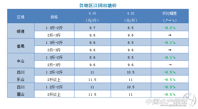 1、本周廣東江團價格與上周相比下跌了0.2元/斤,小魚成交價是8.5元/斤,大魚價格還是9.6元/斤,超大魚價格還是在6.5元/斤。整體下滑,趨勢不大。