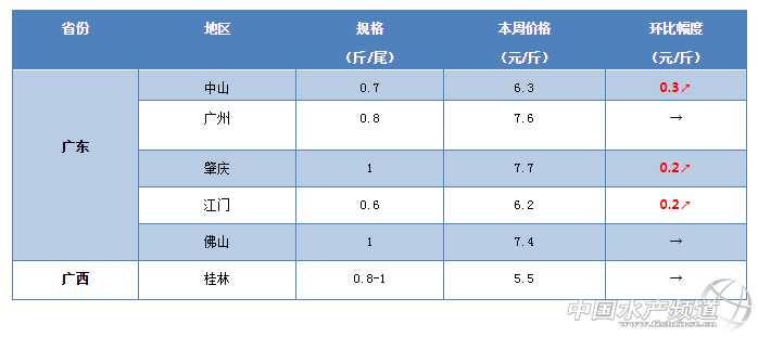 | 中國水產頻道原創報道, 五一臨近,流通商積極備貨!近期塘頭再現魚車排隊搶魚景象,江蘇鯽魚已經賣到9元/斤,珠三角半斤以規格全線突破6元大關,1斤以上的塘頭價7.5元/斤!存塘魚有限,鯽魚行情有望進一步回暖。 文/ 水產前沿 鄭鵬飛 魚車排隊搶魚 一周要聞 隨著“五一”小長假的臨近,近期各大水產市場進入搶購熱潮,多個水產品種行情出現暴漲。華東作為鯽魚的主產區,近期鯽魚塘頭價格出現強勢上漲,大部分地區漲幅超過1元/斤。據了解,今天江蘇地區鯽魚塘頭價已經賣到9元/斤,為了節日備貨,大批魚車排隊搶魚。目前,泰州地區9兩的鯽魚賣到6.3元/斤,相比上周再次上漲了0.5元/斤;鹽城地區1.2斤以上的鯽魚塘頭價8.5元/斤,漲幅超過1元/斤;目前湖北武漢地區鯽魚最新塘頭價已經賣到5.5-6.5元/斤,相比之前最大漲幅接近2元/斤;湖南常德地區鯽魚價格上漲0.3元/斤,1斤以上的湘云鯽塘頭價賣到4.5-4.6元/斤;有養殖戶表示,目前淮安地區的鯽魚塘頭價每天都在漲;福建南平地區鯽魚最新塘頭價5.8元/斤,上漲0.4元/斤;上海大部分地區的鯽魚塘頭價突破6元/斤,部分地區已經突破7元/斤。本周華南地區的鯽魚行情也是整體呈現回暖趨勢,目前中山地區半斤的鯽魚塘頭價基本都已超過6元/斤,部分地區1斤以上的已經賣到7.5元/斤;肇慶地區6兩鯽魚最新報價6.1元/斤,上漲0.3元/斤,養殖戶表示節后有望漲到6.5元/斤。本周東北地區的鯽魚塘頭價暫時沒有明顯變化,不過養殖戶表示最近市場價格也是開始出現好轉,目前沈陽地區已經可以賣到6.2-6.3元/斤。 近期江西部分地區鯽魚塘頭價出現小幅下滑,銷量較之前也是有所減少,湖南岳陽地區的鯽魚塘頭價較上周也是下滑了0.2元/斤,華中部分養殖戶對于目前的魚價行情表示很無奈。不過,隨著五一小長假的來臨,節日消費需求的拉動加上禁漁導致的海鮮斷貨已經使得各地水產品市場開始積極備貨,目前多個淡水品種行情已經出現暴漲。面臨各種海產品的斷貨,目前各種海產品相比往年的價格上漲了約3-5成,目前帶魚已經賣到30元/斤,小黃魚超過40元/斤,大連海鮮市場螃蟹最高賣到180元/斤。而且,近期華中、華東、華南大部分地區新的養殖周期已經正式開始,目前剩下還沒有干塘的魚塘已經不多,節后鯽魚行情有望進一步回暖。 本周行情 華南地區 隨著五一小長假的來臨,節日消費需求的拉動加上禁漁導致的海鮮斷貨,使得近期水產品市場也是積極備貨,多個淡水品種行情看漲。本周華南地區的鯽魚行情也是整體呈現回暖趨勢,目前中山地區鯽魚塘頭價基本都已超過6元/斤,有部分地區賣到7元/斤;肇慶地區塘頭價上漲0.3元/斤,最新報價6.1元/斤,節后有望漲到6.5元/斤;目前廣西地區的鯽魚行情還是沒有明顯變化,大部分塘頭價還是維持在5.5-6元/斤之間。 中山:據養殖戶介紹,目前中山地區大部分鯽魚塘頭價已經超過6元/斤,0.7斤的最新塘頭價維持在6.3元/斤,1斤以上的已經賣到7.5元/斤,預計節后價格還會繼續上漲。 肇慶:本周肇慶地區鯽魚最新塘頭價6.1元/斤,較上周上漲了0.3元/斤,養殖戶表示節后很可能會漲到6.5元/斤。 廣西:目前廣西地區的鯽魚行情還是沒有明顯變化。據養殖戶介紹,昨天桂林地區的鯽魚塘頭價還是維持在5.5元/斤,到目前為止來賓地區的鯽魚塘頭價還是維持上周水平。 華中地區 本周華中地區鯽魚行情有漲有跌,其中湖南和湖北部分地區上漲比較明顯,本周江西地區鯽魚行情還是比較低迷,部分地區塘頭價出現小幅下滑。從養殖戶了解到,目前湖北武漢地區鯽魚最新塘頭價已經賣到5.5-6.5元/斤,相比之前最大漲幅接近2元/斤;湖南常德地區鯽魚價格上漲0.3元/斤,1斤以上的湘云鯽塘頭價賣到4.5-4.6元/斤;最近江西南昌地區鯽魚價格出現小幅下滑,銷量較之前也是有所減少;有養殖戶反映,最近湖南岳陽地區的鯽魚塘頭價較上周下滑了0.2元/斤,最新塘頭價4.6元/斤左右。雖然節假日來臨,但是由于個別市場行情出現反常下跌,養殖戶對于近期的行情還是不敢隨便預測。 江西:本周江西地區的鯽魚行情還是不太好,部分地區再次出現小幅下滑。養殖戶表示,目前南昌地區鯽魚價格也是跌了一點,銷量也有所下降,部分地區塘頭價還是4元/斤。養殖戶表示,目前的魚價行情不好說,總是漲一點就感覺魚似乎不夠賣,價格掉一點又感覺魚多了賣不掉,后期行情還是市場說了算,不敢隨便預測。 湖南:本周湖南地區鯽魚行情整體還是穩中有升,其中常德地區鯽魚價格較之前上漲0.3元/斤,1斤以上的湘云鯽塘頭價賣到4.5-4.6元/斤;岳陽地區的鯽魚最新塘頭價比之前下滑了0.2元/斤,常德養殖戶表示具體行情誰也說不準。 湖北:本周湖北大部分地區的鯽魚行情還是以穩定為主,不過有部分地區上漲勢頭迅猛。從養殖戶了解到,目前武漢地區鯽魚最新塘頭價已經賣到5.5-6.5元/斤,相比之前最大漲幅接近2元/斤;最近隨州地區鯽魚還是維持在5元/斤左右,養殖戶表示當地豬肉價格也是沒怎么漲,魚價暫時也是沒有太大變化;本周洪湖地區的魚價還不是很好,目前草魚還是賣4元/斤,鯽魚還要看魚定價,暫時沒有明顯上漲。 華東地區 華東作為鯽魚的主產區,近期鯽魚塘頭價格出現強勢上漲,多個地區漲幅超過1元/斤。從流通商了解到,目前江蘇地區鯽魚塘頭價已經賣到9元/斤,而且塘頭一堆魚車排隊搶魚,僧多粥少;有養殖戶表示,目前泰州地區9兩的鯽魚賣到6.3元/斤,相比上周再次上漲了0