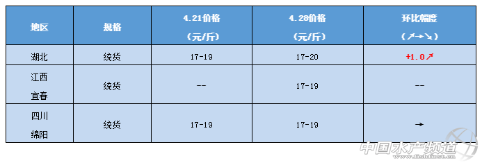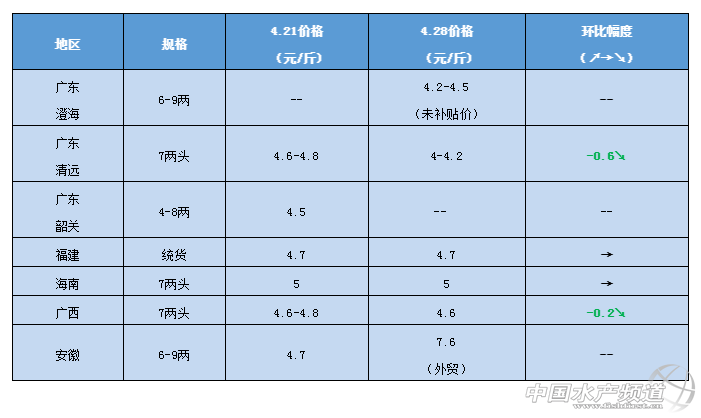 | 中國水產頻道原創報道, 還有大蛙進入市場,出了這批蛙價格才會回漲 文/ 水產前沿 陳曉慶 一周行情簡析 牛蛙 目前牛蛙市場消費端需求有所提升,但由于近期病蛙增多,以及福建南平、江西贛州一帶禁養的影響,牛蛙場被拆除,養殖戶被迫賣蛙,牛蛙價格看漲困難。“還會有一部分大蛙進入市場,預計要出了這批蛙才會漲。”據業內人士預測,五一黃金期并不能帶來牛蛙價格的增長。節假日期間,交通不便,出蛙困難,這也將成為阻礙蛙價增長的主要原因之一。 廣東:廣東澄海4月28日6-9兩規格的牛蛙廠價4.2-4.5元/斤,相比前幾天下降了0.3元/斤。廣東清遠7兩頭規格的牛蛙報價4-4.2元/斤,相比上周下降了0.6元/斤。 福建:福建福州4月28日牛蛙現金價4.1元/斤,賒欠價4.7元/斤。福建地區近期大蛙發病率較高,腸炎、腐皮、脹氣等病害十分嚴重,建議平時喂料需均勻且充足,以及做好保健工作,氣溫變化較大時在飼料中多添加益生菌、維生素、保護腸道的產品,提高牛蛙的免疫能力。 海南:海南地區4月28日7兩頭牛蛙報價5元/斤,本周價格較為平穩,波動幅度不大。 廣西:廣西南寧4月28日7兩頭牛蛙報價4.6元/斤,相比上周下降了0.2元/斤,小幅下跌。廣西地區本周天氣較為穩定,蛙苗情況較好。 安徽:安徽地區4月28日牛蛙外貿價格達到7.6元/斤,主要銷往國外日本市場。由于市場對于產品的要求較高,需提供無疾病且全程無使用抗生素的牛蛙,雖產量較小,但價格卻大大提高,實現了產品的增值。 青蛙(黑斑蛙) 目前大部分地區的價格趨于穩定,江西、四川等地報價在17-19元/斤,湖北地區17-20元/斤,相比上周增長1元/斤。 泰國虎紋蛙 目前廣東地區的老蛙已經所剩不多,但新蛙仍然還不夠規格上市,泰國虎紋蛙市場價格有望回升。 注:上述價格及行情分析僅供參考,市場有風險,入市須謹慎 |