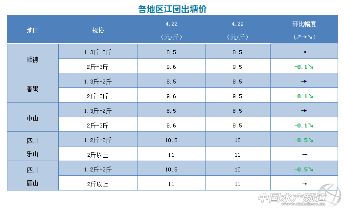 | 中國水產(chǎn)頻道原創(chuàng)報道, 文/圖 何氏水產(chǎn)、水產(chǎn)前沿 李靜 江團 1、廣東江團本周價格與上周相比基本持平,只是中魚下跌了0.1元/斤,小魚還是8.5元/斤,中魚9.5元/斤。由于3斤以上的大魚需求量增加,價格上漲了0.5元/斤,達到7元/斤了。節(jié)前這兩天銷量也上升了不少。 2、本周四川江團小魚價格持續(xù)下跌了0.5元/斤至10元/斤,大魚價格11元/斤,與上周價格一樣。現(xiàn)在本地銷量不大,存塘量也能滿足市場需求,預(yù)測接下來價格變化不大,銷量也會持穩(wěn)。 |