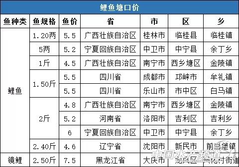 | 中國水產頻道報道, 通威農牧資訊 張梅 鯉魚 本周全國鯉魚塘口均價5.36元/斤,環比上漲1.9%。 華北地區:沈陽地區近期外地魚販較少,價格下跌0.2元/斤。黑龍江地區鏡鯉存塘較少,2.5斤規格的鯉魚已達7.5元/斤。河南地區存塘逐漸減少,價格上漲0.2元/斤。 華西地區:寧夏地區受北方魚車減少,加之本地存塘魚減少,鯉魚價格較上周上漲0.2-0.5元/斤。 走勢預測:華北地區鯉魚存塘減少,預計鯉魚價格還會繼續上漲。 |