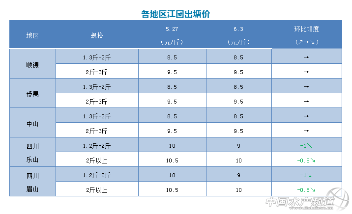 1、廣東江團本周價格與上周還是保持一樣,小魚還是8.5元/斤,中魚9.5元/斤,超大魚還是7元/斤。現在廣東江團存塘量不多,主要是番禺產區比較多,但由于現在總體銷量也不多,暫時能滿足市場需求,價格暫時保持穩定,銷量和上周基本持平。預計接下來價格基本穩定,銷量持穩。