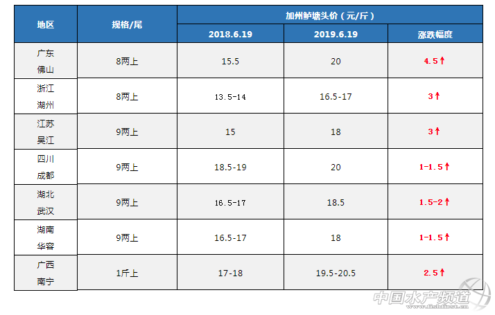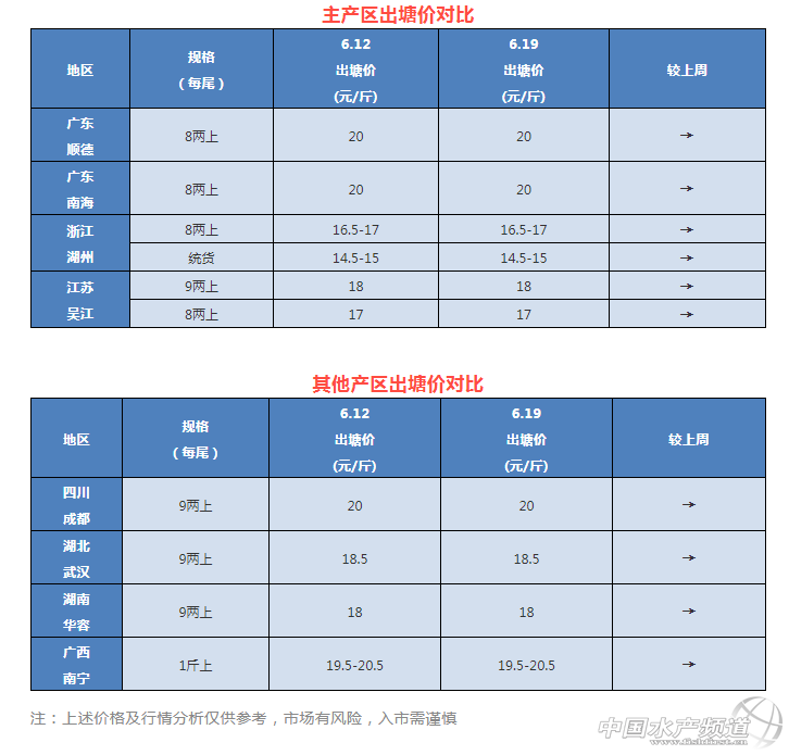 | 中國水產頻道原創報道, 6月19日各產區加州鱸最新塘頭報價與行情簡析 文/圖 杰大飼料 水產前沿 李曉欣 聯合發布 經歷了一個多月的火速上漲后,本周各產區加州鱸塘頭價進入平穩期。據本平臺對加州鱸塘頭價的監測,目前各產區魚價相比去年同期高出1-4.5元/斤不等,其中廣東佛山漲幅最高達4.5元/斤,令人驚嘆。 由于前期價格上漲較猛,市場需要一定緩沖,業內人士預計接下來魚價漲幅將有所放緩。近期高溫多雨天氣,存塘魚應激損耗較大,出魚“硬骨”現象易發,部分塘口的鱸魚苗感染爛嘴爛尾病,出現死亡損耗,建議養殖戶朋友做好相應的防治措施,同時密切關注魚價走勢和天氣,根據自身情況適時出魚,確保養殖收益。 今日各地加州鱸塘頭價及本周行情分析 廣東順德:今天報價8兩上20元/斤,6兩上價格按實際塘魚規格發價,順徳本地舊魚存塘量已經不多,各區域零零散散還有少量存塘,進入高溫季節,養殖戶賣魚時機需要理性看待合理選擇出魚時間。 廣東南海:今天報價8兩上20元/斤,魚價與上周持平,實際價格因塘魚規格而定。南海區域目前僅沙頭還有一定存塘舊魚,周邊舊魚量少。由于天氣雨水較多,近期出魚硬骨現象還時有發生,對水質要求特別高,需要引起重視。 浙江湖州:湖州達上市規格的存塘魚不足1成,8兩上報價16.5-17元/斤,統貨14.5-15元/斤左右,魚價一周企穩。當地存塘不多,部分還有存塘的養戶在惜售等價,整體出魚量不大,流通商多到周邊吳江地區收魚。 江蘇吳江:吳江加州鱸8兩上報價17元/斤,8兩半17.5元/斤,9兩上18元/斤,魚價與上周持平。現在吳江整體存塘量仍較大,但大規格鱸魚較為緊缺,預計短期內魚價或會上漲。 四川成都:今天報價9兩上20元/斤,本周魚價持穩,由于目前價格達到部分養殖戶心理預期,部分養戶趕著清塘,所以出魚意向比較積極。 湖北武漢:武漢9兩上鱸魚報價18.5元/斤左右,魚價一周持穩。由于湖北本地較為缺魚,部分流通商到周邊吳江、華容等地拉魚以滿足市場需求。 湖南華容:今天華容9兩上鱸魚報價18元/斤,目前價格已經持穩了20天左右。由于近期高溫出魚容易應激,加上看好后市行情,當地部分還有存塘舊魚的養戶惜售待價,整體出魚量不大。 廣西南寧:南寧本地存塘大規格鱸魚估計還有兩三成,本周1斤上塘頭價維持在19.5-20.5元/斤,由于高溫出魚應激較大,部分養殖戶出魚積極性下降,惜售待價。 |