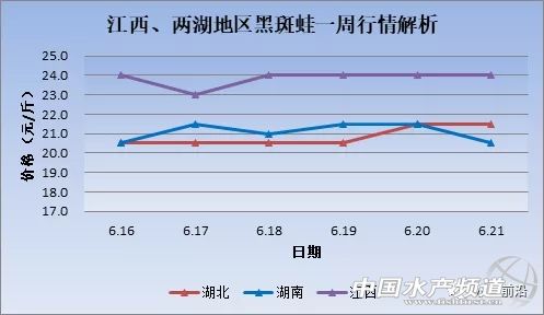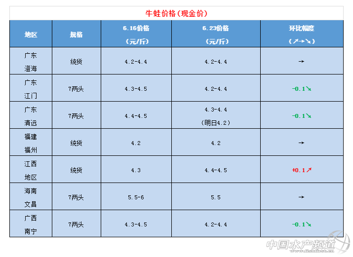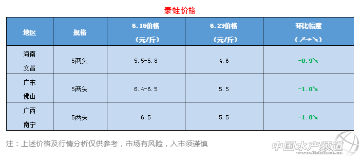 | 中國水產頻道原創報道, 本周黑斑仍居高價位,牛蛙、泰蛙穩中有跌。 文/ 水產前沿 陳曉慶 圖/ 金浦飼料 一周行情簡析 牛蛙 本周牛蛙價格仍舊低迷,穩中有跌。廣東澄海、江門、清遠等地牛蛙價格在4.2~4.4元/斤左右,相比上周下降了0.1元/斤,福建福州今日牛蛙現金價4.2元/斤、欠賬4.9元/斤,近期價格穩定,與上周持平。江西地區今日報價4.4~4.5元/斤,與上周相比上漲了0.1元/斤。海南地區因牛蛙養殖戶較少,價格要比內地較高,7兩頭規格的牛蛙今日報價5.5元/斤,與上周持平。廣西南寧今日報價4.2~4.4元/斤,與上周相比下降了0.1元/斤。 據悉,廣東潮汕地區的放苗高峰期即將到來,需求量逐步增長。40~100只/斤的小四腳價格在12~20元/斤不等,而今年的牛蛙價格低迷,養殖戶放苗的積極性也不如去年。 青蛙(黑斑蛙) 與牛蛙、泰蛙截然相反,本周黑斑蛙仍然處于高價位,江西地區本周報價24元/斤。按照往年的價格趨勢來看,再過一段時間(預計十天左右,六月底到七月初),隨著黑斑蛙供應量增加,價格會有所下滑。一般到了10月份之后,隨著氣溫的降低,青蛙捕撈越來越困難,供應量逐步減少,價格將再次回升。 泰國虎紋蛙 |