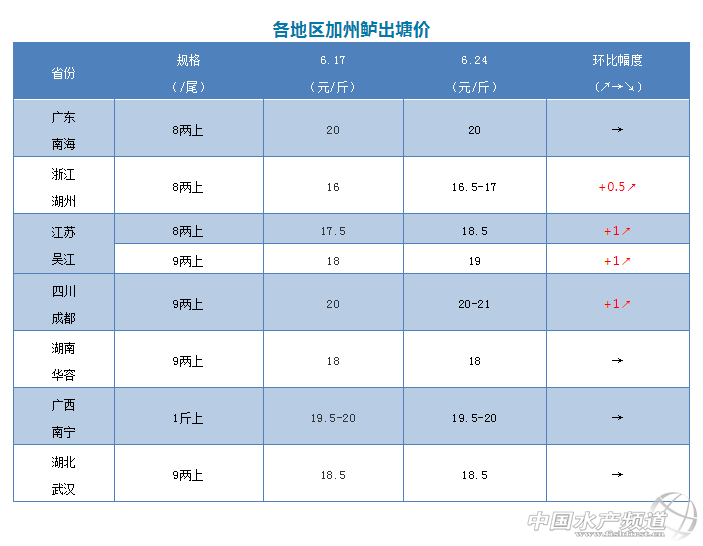 | 中國水產頻道原創報道, 文/圖 何氏水產、水產前沿 李靜 加州鱸 本周全國加州鱸價格除浙江湖州、江蘇吳江、四川成都價格比上周上漲了0.5-1元/斤,其他產區價格與上周保持穩定。 1、廣東鱸魚8兩以上開塘價跟上周一樣,還是20元/斤,9兩或者1斤以上的開塘價也是一樣,實際成交價格還是要看魚的質量和8兩以上的比例來定價,現在大部分都是在清塘出魚或者裝6兩以上為主,沙頭產區則出8兩以上為主。現在存塘量主要是以沙頭產區為主,外區的存塘量很少了,都是出塘底魚為主。現在高溫天氣和下雨天氣交替出現,魚的質量都不是很好,損耗比較大,大部分收購商都在虧本。由于價格上漲,現在廣東整體銷量都在下降,接下來價格暫時穩定。 2、浙江湖州鱸魚價格還是出統貨為主,8兩以上價格比上周上漲了0.5元/斤,達到16.5-17元/斤。統貨價格14.5--15.5元/斤,現在湖州存塘舊魚已經基本出完,銷量也不大。江蘇吳江本周價格也比上周上漲了1元/斤,8兩以上還是18.5元/斤,9兩以上19元/斤,由于現在當地大魚頭的存塘越來越少,目前整體銷量有所下降,預計短期內價格還會有波動。四川成都本周價格也比上周上漲了1元/斤,超過20元/斤,當地舊魚存塘已經不多,養戶出魚積極性較高。湖南華容、廣西南寧、湖北武漢本周也都保持穩定,銷量也基本一樣。 |