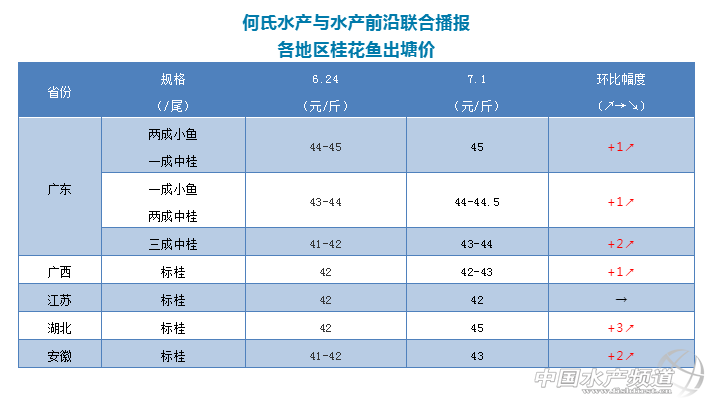 | 中國水產頻道原創報道, 文/圖 何氏水產、水產前沿 李靜 桂花魚 1、本周廣東桂魚價格再次上漲,與上周相比漲了1-2元/斤,目前最好規格的魚(6-7成標桂,1成中桂)價格上漲到45元/斤左右,現在有個別收購商訂到7月中旬的魚超過45元/斤,偏大點的魚價格最高也漲到43-44元/斤左右。本周市場行情與上周差不多,特別是偏大魚,行情更差,銷量減少,市場差價少。標桂市場行情比上周好了些,訂單比上周多,但現在收購商開魚虧本,所以都不敢開很多魚,市場標桂有缺口。現在存塘量還是以偏大魚為主,外圍的產區桂魚存塘量更少,現在存塘量最多的產區還是三水和四會,預計接下來鱖魚價格會繼續穩中有升,直到7月中下旬新魚上市。 2、外省四大產區湖北產區的標桂價格上漲3元/斤,達到45元/斤外,安徽標桂上漲了3元/斤。外省產區的存塘量基本沒有,只是某種規格還有一點。 |