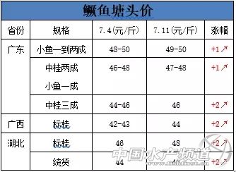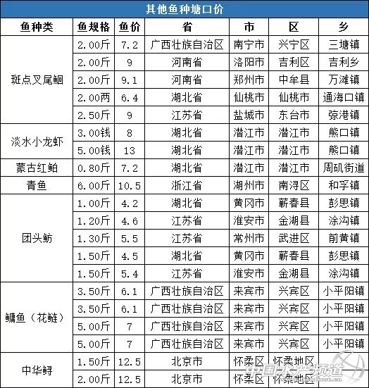 中國水產頻道報道, 極端天氣、養殖場被拆除、南北多地被禁養……今年水產養殖經歷的磨難太多,所幸本周多品種魚價開始上漲!下半年,哪條魚最掙錢? 自昨日開始,南方地區新一輪強降雨上線,浙江、江西、湖南、廣西等地普遍出現暴雨或大暴雨天氣,安徽黃山、江西九江、廣西桂林局地出現特大暴雨。 △央視財經《國際財經報道》欄目視頻 廣西梧州:西江1號洪峰過境 水位緩慢回落 江西:強降雨致鄱陽湖水域面積擴大 受近期強降雨影響,鄱陽湖水體面積已擴大至4030平方公里,鄱陽湖星子站、康山站等均出現超警戒線水位。 云南騰沖 洪水圍村 850人緊急轉移 水利部今天早晨5點的消息:受上游干流及鄱陽湖水系來水影響,長江中游干流九江水文站今天5時水位漲至20.00米,達到警戒水位(20.00米),依據水利部《全國主要江河洪水編號規定》,為長江2019年第1號洪水。 預計,7月13日8時至14日8時,安徽南部、浙江大部、江西中北部、湖南中南部、廣西中北部、廣東北部、貴州南部、云南西北部和東部、西藏東南部等地的部分地區有大到暴雨。上述部分地區伴有短時強降水(最大小時降水量20-50毫米,局地可達70毫米以上)、局地有雷暴大風等強對流天氣。涉及以上地區的養殖戶需警惕極端天氣對養殖的影響,更要注意個人安全! 以下是本周多魚種塘頭價格播報,涉及品種有鱖魚、加州鱸魚、烏鱧、黃顙魚、斑點叉尾鮰、草魚、鯽魚、鯉魚、羅非魚、團頭魴、淡水小龍蝦、鳙魚(花鰱)等。 淡水特種魚類 行情解析:本周鱖魚價格持續高位,穩中有升。現在廣東鱖魚統貨塘頭訂魚價格以48元/斤為主,個別規格好的訂49-50元/斤,也有人開始訂8月初出的新魚38元/斤。預計7月中下旬將持穩或小幅上漲。受廣東鱖魚價格影響,廣西、湖北鱖魚價格本周也上漲了2元/斤左右。據流通商消息,目前的價格市場已經難以接受,預計繼續上漲的空間不大了。 桂花苗:最近20天左右鱖魚苗供大于求,公分苗0.09-0.13元/公分左右,預計一個星期后行情或有好轉。 餌料魚:新餌料魚供應充足,塘頭價格呈下行趨勢,本周繼續下跌0.2-0.4元/斤左右。 黃顙魚 本周全國黃顙魚均價為11.9元/斤,同比上漲48.75%,環比上漲5.68%。 華南地區:廣東佛山地區存塘魚較少,市場流通較好,新魚預計8-9月上市,價格上浮0.5元/斤。 華西地區:四川眉山、樂山地區黃顙魚存塘減少,據當地魚販介紹,市場需求量較大,魚販直接跟經銷商、養殖戶預定,價格較上周上漲0.5-1元/斤。 華中地區:湖北地區去年存塘魚不足3成,新魚要11月初才能大量出售,預計8-9月份黃顙魚價格會有上漲趨勢。 華東地區:浙江地區3.5兩黃顙魚較多,4兩炮頭魚較少,價格較上周上漲0.5元/斤。 走勢預測:近期黃顙魚有大部分地區供不應求,預計價格穩中有漲。 加州鱸魚 本周全國加州鱸魚均價為20.25元/斤,環比上漲1.25%。 華東地區:浙江湖州地區加州鱸魚隨全國市場處于高價位階段,市場流通較快,價格與上周持平。 華西地區:四川地區加州鱸魚存塘極少,新魚還未達上市規格,市場需求量較大,1斤規格達20.5元/斤。 走勢預測:加州鱸魚存塘逐漸減少,市場流通較快,新魚未達上市規格,預計近期穩中有漲。 生魚 本周全國生魚均價為7.27元/斤,同比下跌31.42%,環比下跌0.41%。 華南地區:廣東地區存塘越來越少,市場流通比較穩定,廣東省每天銷售約300萬斤,2斤價格與上周基本持平,1斤規格的價格較上周下跌0.1元/斤。 華西地區:四川樂山地區價格與上周持平。 走勢預測:目前生魚市場存塘少,市場流通小,價格相對穩定。 常規淡水魚類 草魚 本周全國草魚塘口均價4.65元/斤,同比下跌15.45%,環比上漲0.43%。 華南地區:廣東清遠地區大車拉魚較多,價格相對較低,價格下跌0.2-0.3元/斤;中山地區存塘較大,養殖戶轉養特種魚達30%,今年基本無外地水車到當地拉魚,價格較上周有輕微下跌;惠州、佛山、云浮等地價格與上周基本持平。廣西地區庫存較多,市場消費疲軟,價格下跌0.2元/斤。 華中地區:湖北、湖南、江西、安徽等地草魚價格跌破成本價,養殖戶出魚意愿不強,華中地區價格較上周呈下跌趨勢。江西、湖南等地受暴雨極端天氣影響,養殖戶集中拋售,造成價格持續下跌0.1元/斤。 華西地區:四川成都地區受江西、湖南等地暴雨影響,市場沖擊減少,價格上浮0.1元/斤。重慶、寧夏、綿陽等地價格與上周持平。 華北地區:河南地區草魚價格在4.3-4.5元之間浮動,去年的存塘魚還有70%,主要規格集中在3-5斤,今年放養草魚的養殖戶較少,新魚主要規格為6-7兩,還未達上市規格。 走勢預測:近期受極端天氣、市場流通受阻等影響,預計價格還會持續下跌。 鯽魚 本周全國鯽魚塘口均價6.74元/斤,同比上漲8.01%,環比上漲7.67%。 華東地區:江蘇地區受鯽魚鰓出血、敗血癥等疾病影響,死魚慘重,老魚基本出完,新魚還未達上市規格,0.5斤以上價格呈上漲趨勢,0.5斤以下價格維穩,鹽城地區9.5兩鯽魚價格達10元/斤,淮安地區大鯽魚價格較高,8兩鯽魚價格7元/斤。 華西地區:四川成都地區受外省魚沖擊較少,價格上漲0.1-0.3元/斤。德陽、綿陽地區價格與上周持平。 走勢預測:受鯽魚鰓出血影響,存塘大幅減少,預計鯽魚價格穩中有漲。 鯉魚 數據分析:本周全國鯉魚塘口均價5.27元/斤,同比上漲3.54%,環比下跌3.66%。 華北地區:河南地區老魚存塘基本減少,目前存塘僅20-30%,近期市場流通較快,基本在本地及周邊區域銷售,基本無外
