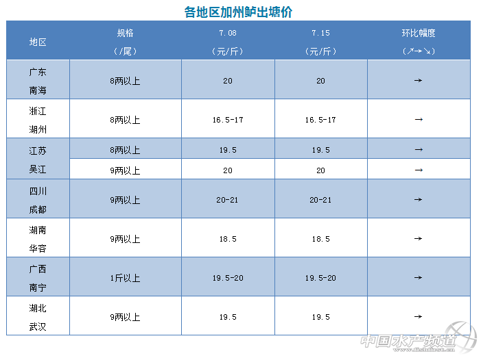 | 中國水產頻道原創報道, 文/圖 何氏水產、水產前沿 李靜 加州鱸 本周全國加州鱸價格都保持穩定。 1、廣東鱸魚8兩以上開塘價跟上周一樣,還是20元/斤。目前鱸魚舊魚存塘主要集中在沙頭產區,還有部分其它地區的反季節魚但量不大。目前高溫天氣存塘壓力較大,養戶出魚積極高,但量不多。廣東鱸魚最近銷量少,價格以持穩為主。 2、浙江湖州鱸魚價格還是出統貨為主,8兩以上價格本周保持穩定,還是16.5-17元/斤,統貨價格14.5-15元/斤,當地存塘量已經很少,基本很少出魚,流通多到江蘇吳江地區拉魚。江蘇吳江本周價格保持穩定,8兩以上還是19.5元/斤,9兩以上20元/斤,本地大規格魚已經不多了,銷量跟上周也差不多,預計后期價格變化不會太大。四川成都本周價格保持穩定,還是20-21元/斤,老魚存塘量已基本沒有,養戶出魚積極性較高。湖南華容、湖北武漢本周都保持穩定,湖北本地較為缺魚,部分流通商到吳江、華容地區收魚供應市場。湖南華容本周價格也保持穩定,近期武漢、廣東等地區的流通商到華容收魚增多,還有存塘魚的養戶看好后市行情,出魚積極性不高。 |