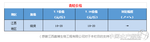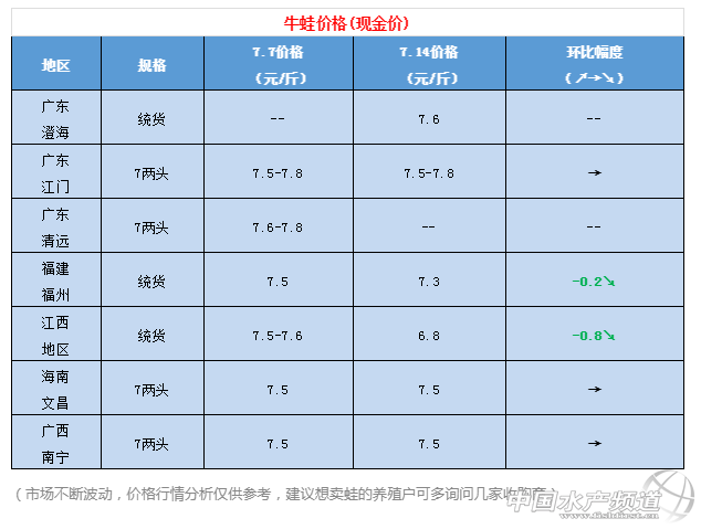 | 中國水產頻道原創報道, 7月14日最新蛙價行情周報 文/水產前沿 陳曉慶 一周行情簡析 牛蛙 本周的牛蛙價格仍舊漲跌不定,前幾天牛蛙價格持續上漲,最高達到了8元/斤,而到了周末又出現了下滑的趨勢。 廣東地區:澄海目前沒有大蛙,牛蛙收購價格在7.6元/斤左右。江門7兩頭牛蛙今日價格7.5-7.8元/斤,與上周持平。廣州附近地區的新蛙預計在八月份會有少量上市,而澄海地區的牛蛙預計要到農歷十月份左右才能上市。 福建地區:福建福州今日牛蛙現金價7.3元/斤,欠賬7.8元/斤,與上周相比下降了0.2元/斤;漳平今日現金價7.3元/斤,廠家收購價8元/斤,明日收購價將下降0.5元/斤;廈門地區明日牛蛙現金價6.8元 /斤,漳州明日報價6.9-7元/斤。目前福建地區主要受拆遷、暴雨天氣影響集中出蛙,價格有所下滑。 江西地區:江西地區今日報價6.8元/斤,與上周相比下降了0.8元/斤。近期江西地區受強降雨、雷暴大風等強對流天氣影響,水位上漲,江西廣昌、萬安等地的禁養行動也正在開展,雙重壓力下,養殖戶也不得不出蛙。 視頻:昨日江西永州地區受河水倒灌影響,青蛙泥鰍等養殖池塘被河水淹沒,附近多處養殖戶受到了不同程度的損失。 海南地區:本周海南地區7兩頭牛蛙價格7.5元/斤,與上周持平。 廣西地區:本周廣西南寧7兩頭牛蛙價格7.5元/斤,與上周持平。 青蛙(黑斑蛙) 目前各個地區的新蛙已經陸陸續續上市。江西地區今日青蛙批發價格20元/斤,出貨價18-19元/斤。目前江西地區的黑斑蛙新蛙規格還比較小,養殖戶多是挑大蛙去賣,出塘量不多,但消費市場需求量依然很高。 泰國虎紋蛙 本周泰蛙價格微跌,廣西、廣東、海南等地的價格相比上周下降了0.1-0.3元/斤。 |